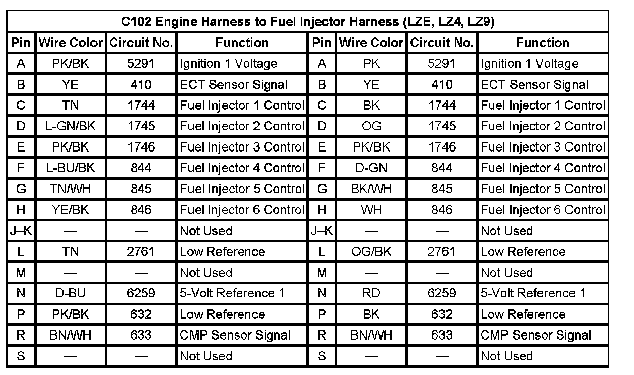 C102 Engine Harness To Fuel Injector Harness (LZE,LZ4,LZ9) (Pin A To S):