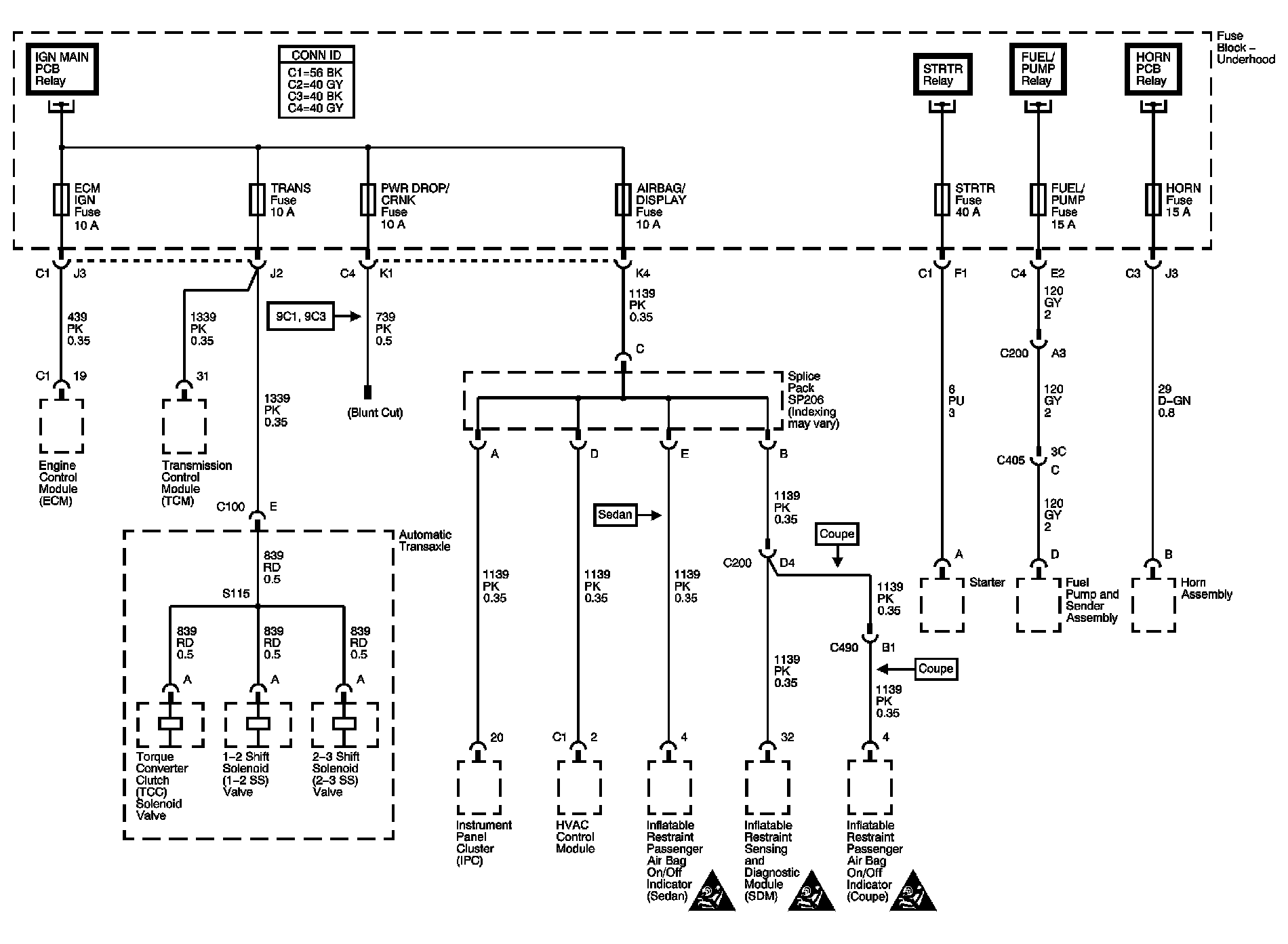 ECM IGN, TRANS, PWR DROP/CRANK, AIRBAG/DISPLAY, STRTR, FUEL/PUMP, and HORN Fuses