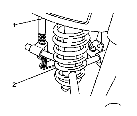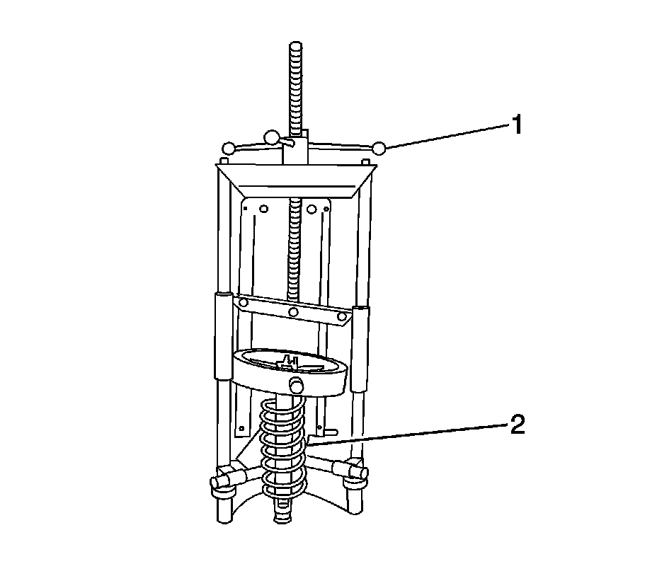 6. Loosen the compressor forcing screw (1) until the upper strut mount and coil spring (2) may be removed.