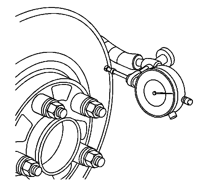 * Mount a dial indicator, J 45101, or equivalent, to the steering knuckle and position the indicator button so it contacts the brake rotor friction surface at a 90 degree angle, approximately 13 mm (0.5 in) from the outer edge of the rotor.