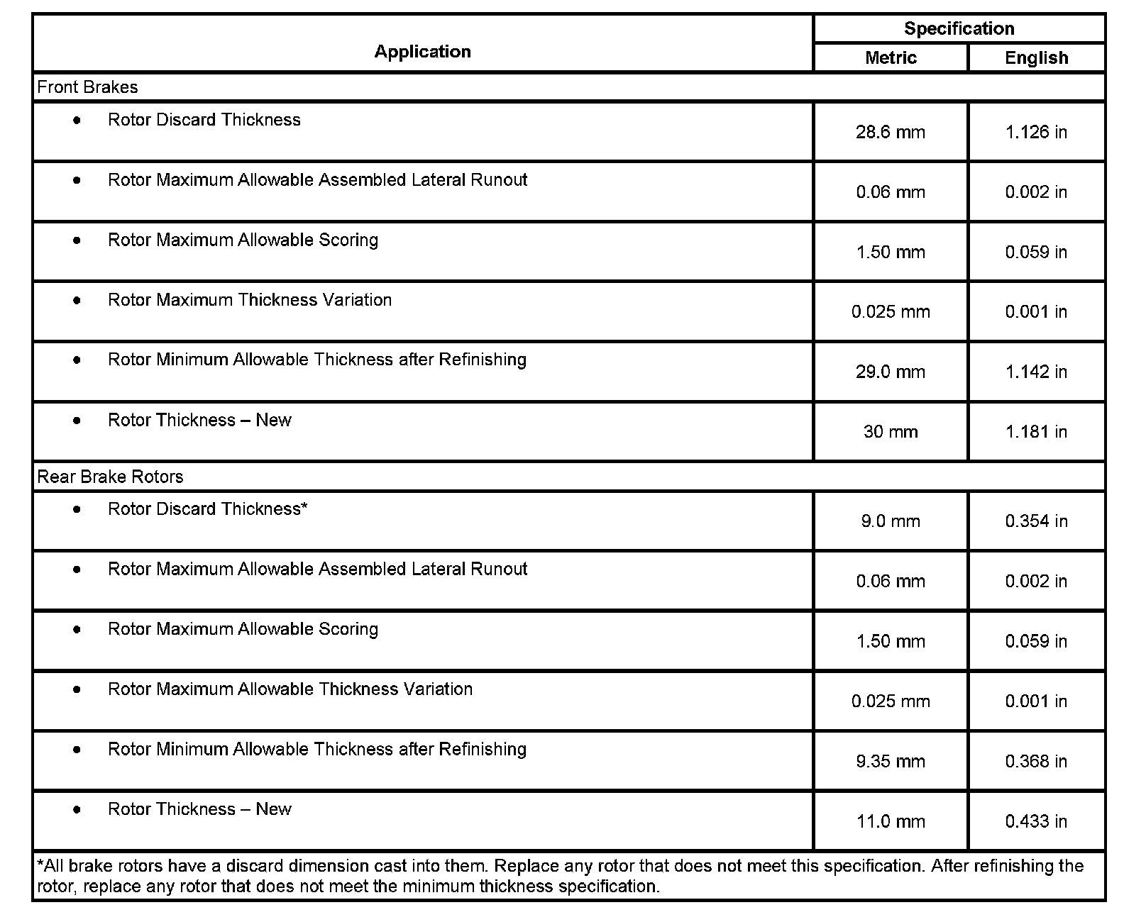 Disc Brake Component Specifications: