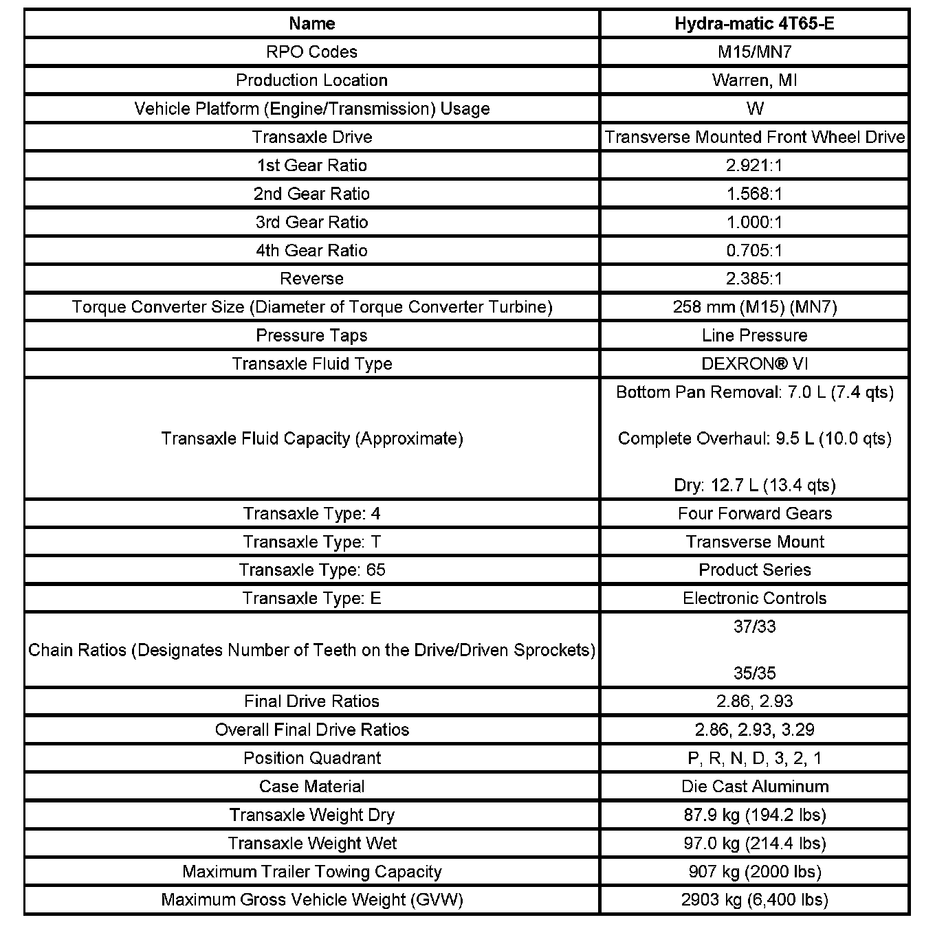 Transmission General Specifications: