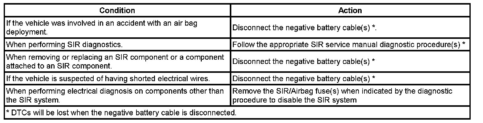 There are several reasons for disabling the SIR system, such as repairs to the SIR system or servicing a component near or attached to an SIR component. There are several ways to disable the SIR system depending on what type of service is being performed. The following information covers the proper procedures for disabling/enabling the SIR system.
