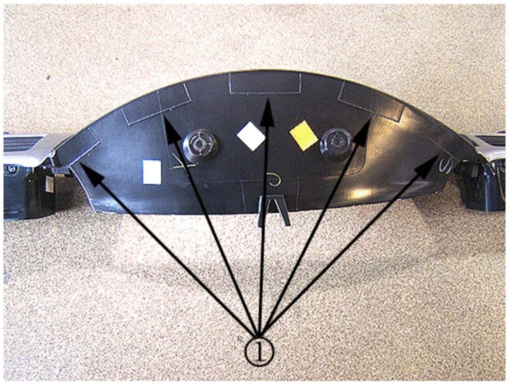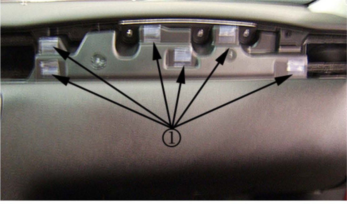 Install two pieces of anti-squeak tape to the two knee bolster retainer locations (1).