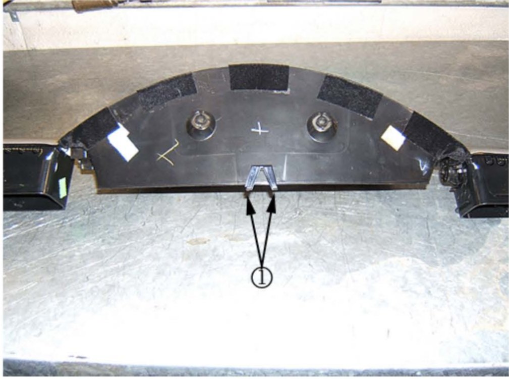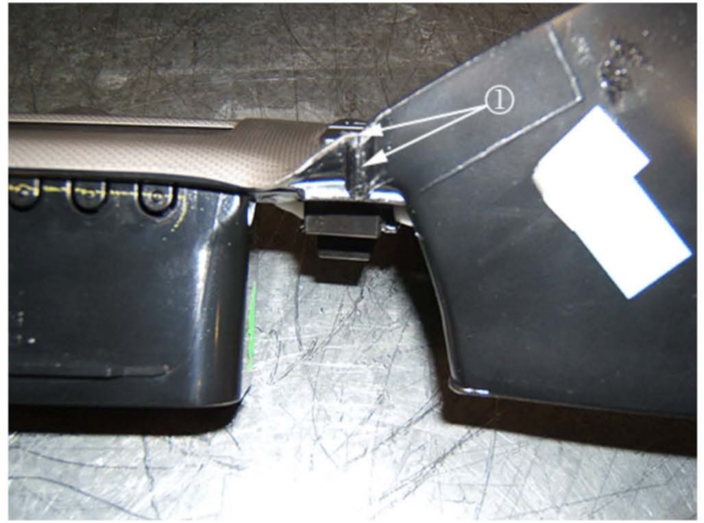 If the vehicle already has the tape installed, it will be necessary to inspect the tape at the rear outer edges. The flocking tape should be wrapped around the rear outer edges (1) of the IP trim panel.
