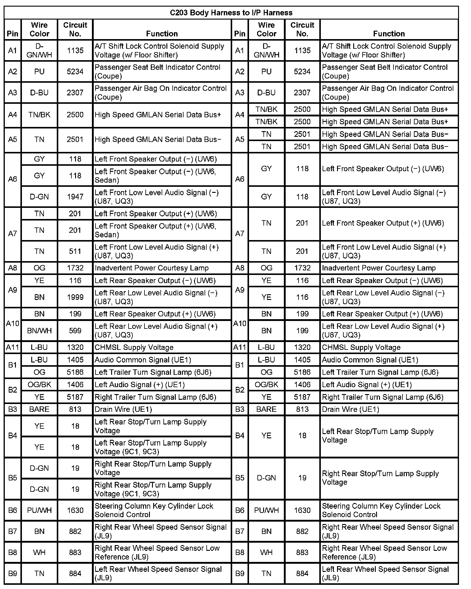 C203 Body Harness To I/P Harness (Pin A1 To B9):