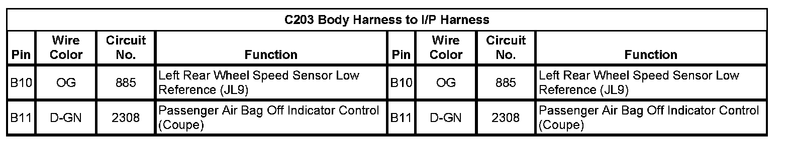 C203 Body Harness To I/P Harness (Pin B10 To B11):