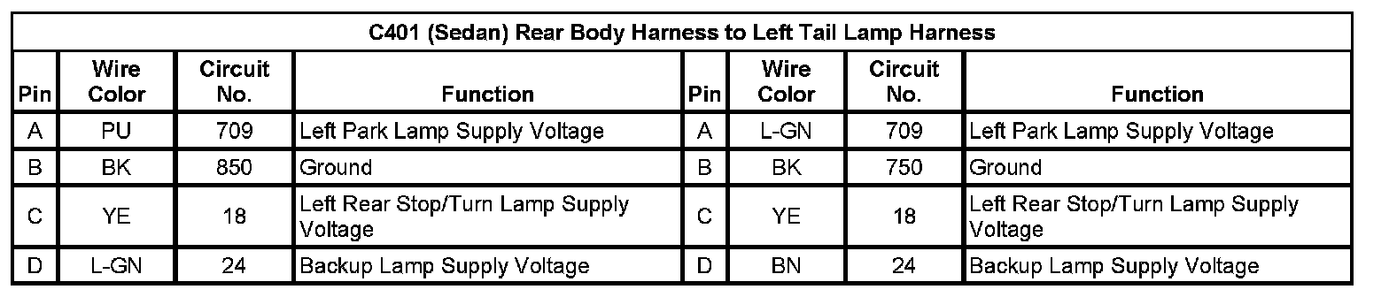 C401 (Sedan) Rear Body Harness To Left Tail Lamp Harness (Pin A To D):