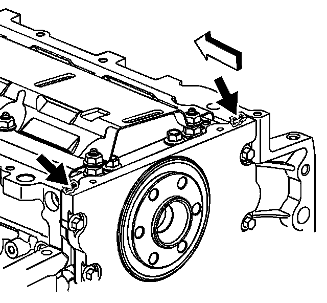 1. Apply a 5 mm (0.2 in) bead of sealant GM P/N 12378521 (Canadian P/N 88901148), or equivalent, 20 mm (0.8 in) long to the engine block. Apply the sealant directly onto the tabs of the rear cover gasket that protrude into the oil pan surface.