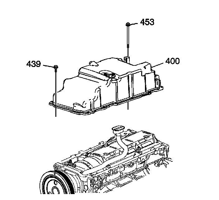 2. Install the oil pan bolts (439, 453) to the pan and through the gasket.