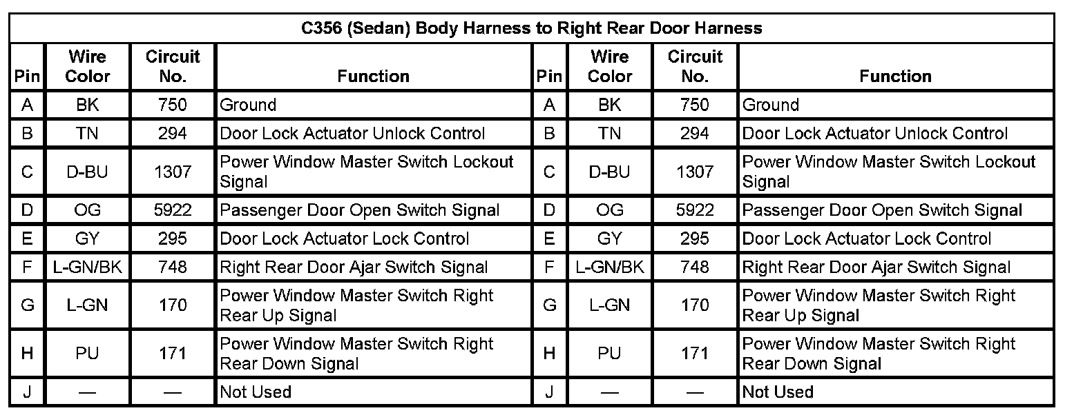 C356 (Sedan) Body Harness To Right Rear Door Harness (Pin A To J):