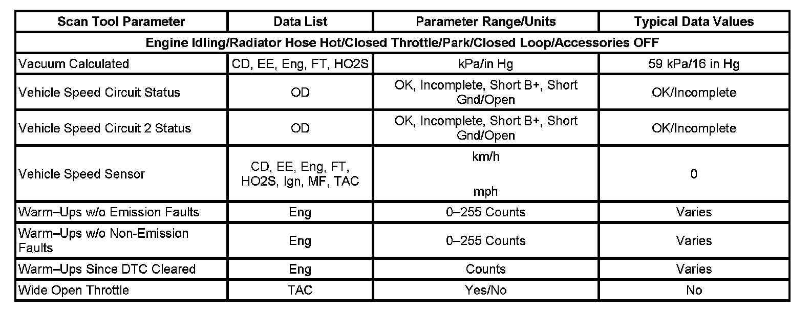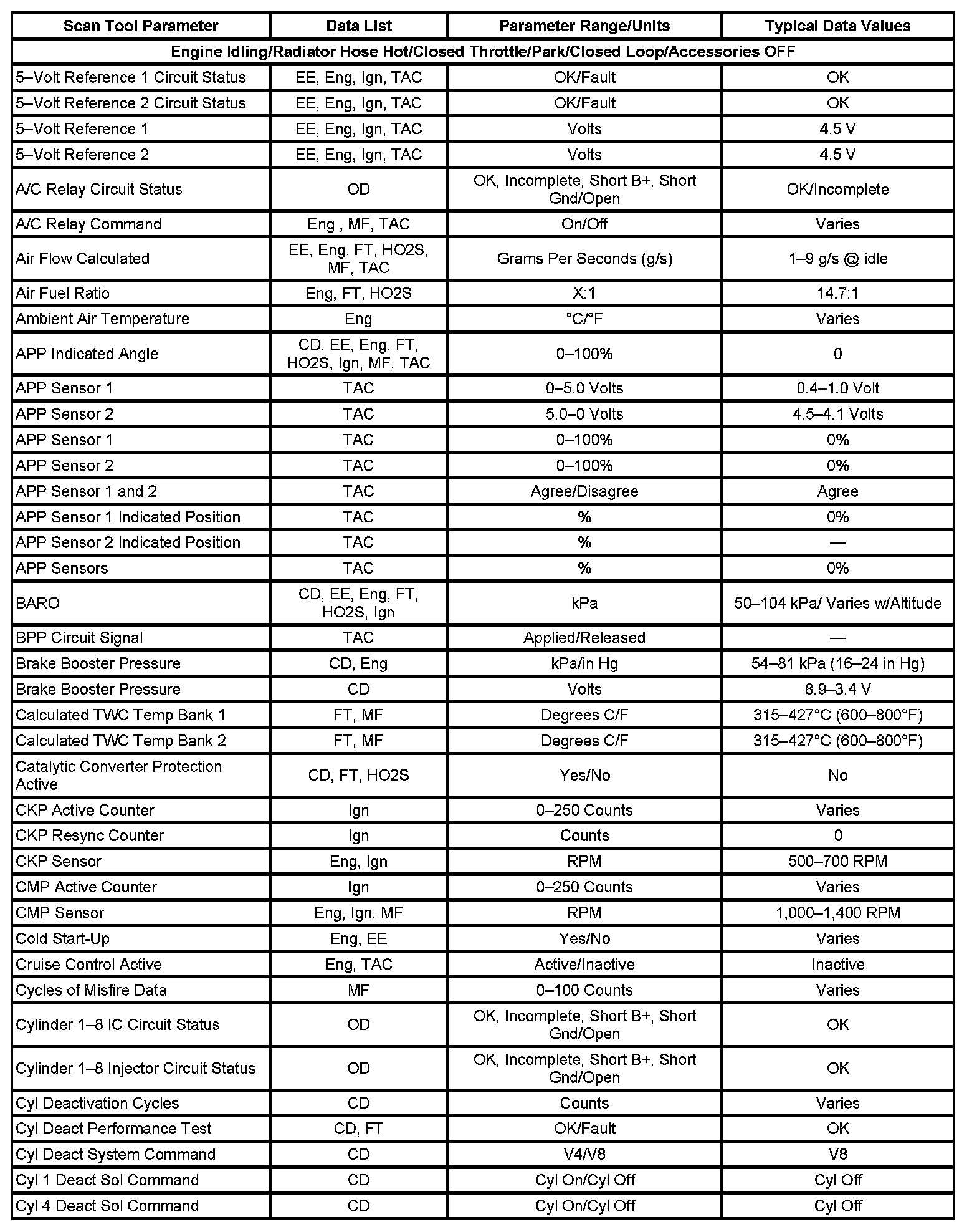 The column labeled Data List indicates where a parameter can be located on the scan tool. Refer to the scan tool operating manual for the exact locations of the data lists. The following is a description of each term listed:
