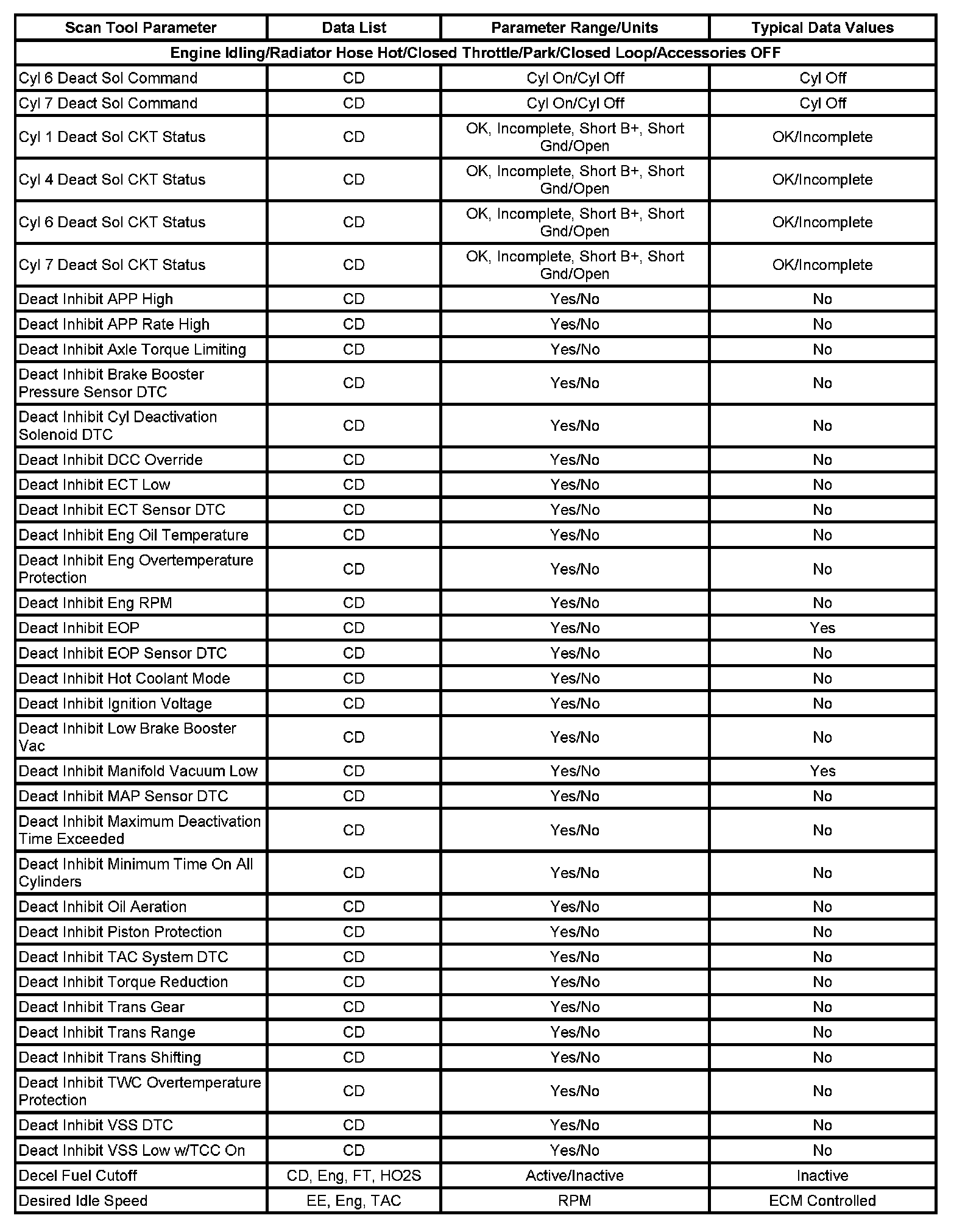 - Cylinder Deactivation Data List