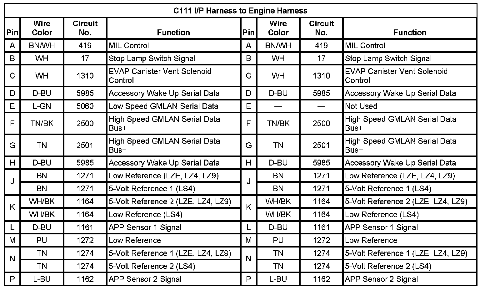 C111 I/P Harness To Engine Harness (Pin A To P):