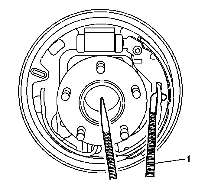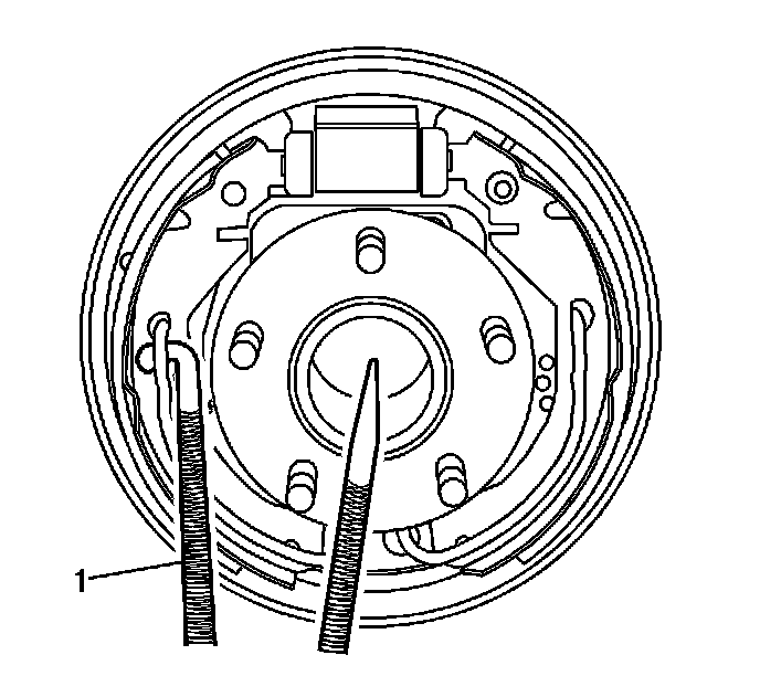 2. Position the hook end (1) of the J 38400 under the universal spring and lightly pull the universal spring end out while installing the trailing brake shoe. Ensure that the universal spring properly engages the brake shoe web hole.