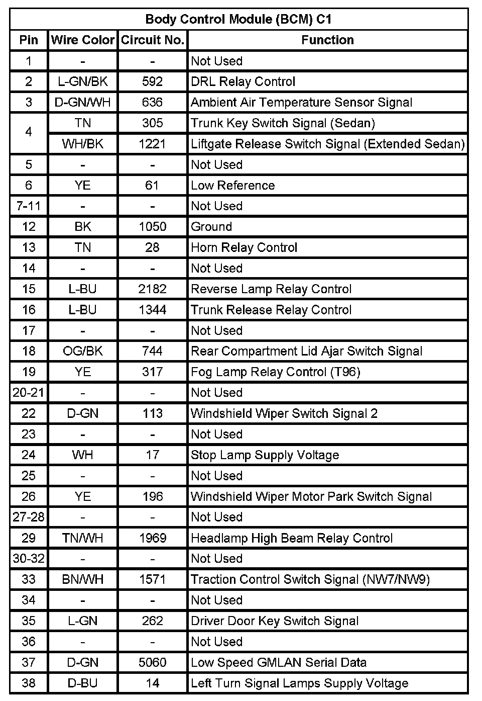Body Control Module (BCM) C1 (Pin 1 To 38):