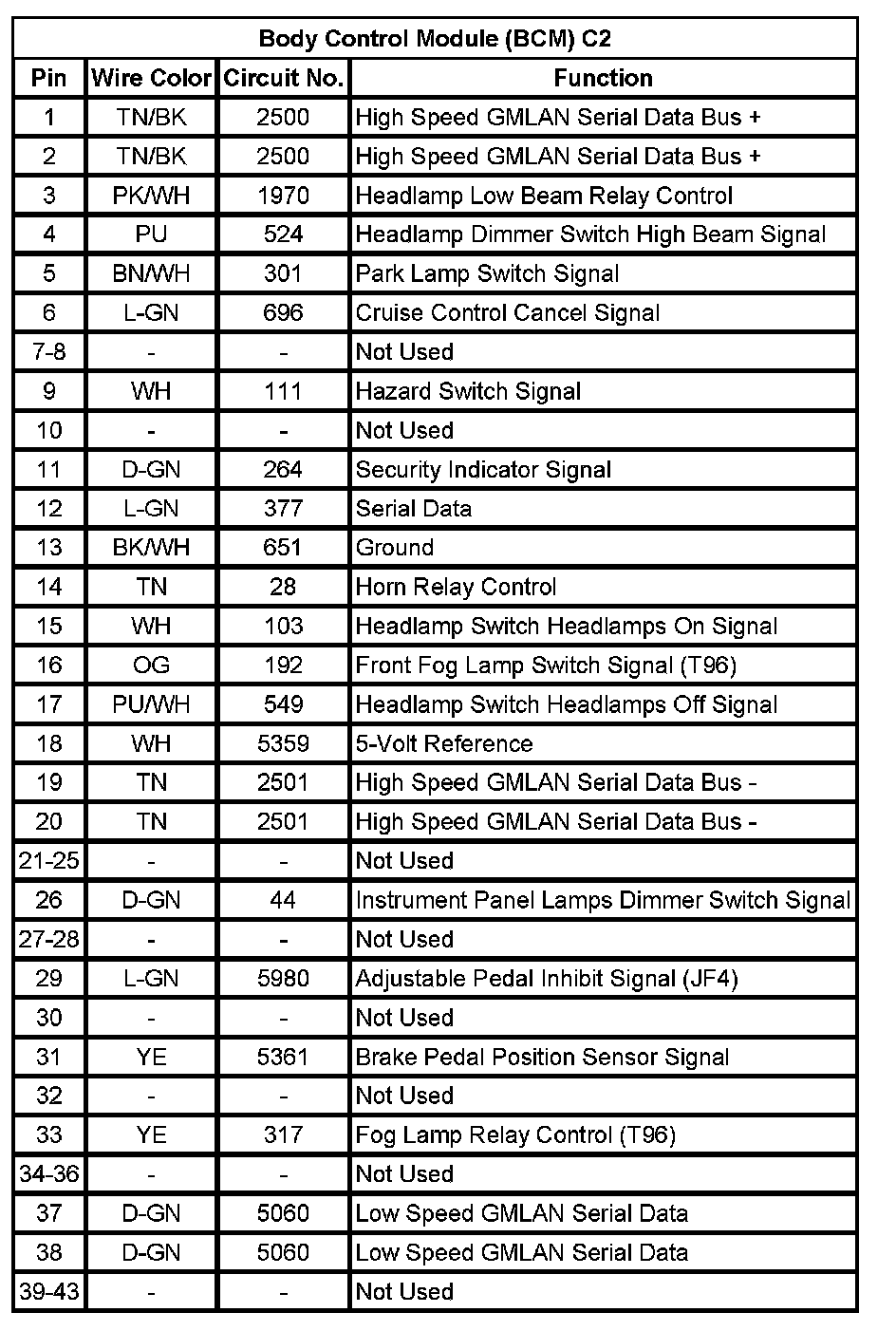 Body Control Module (BCM) C2 (Pin 1 To 43):