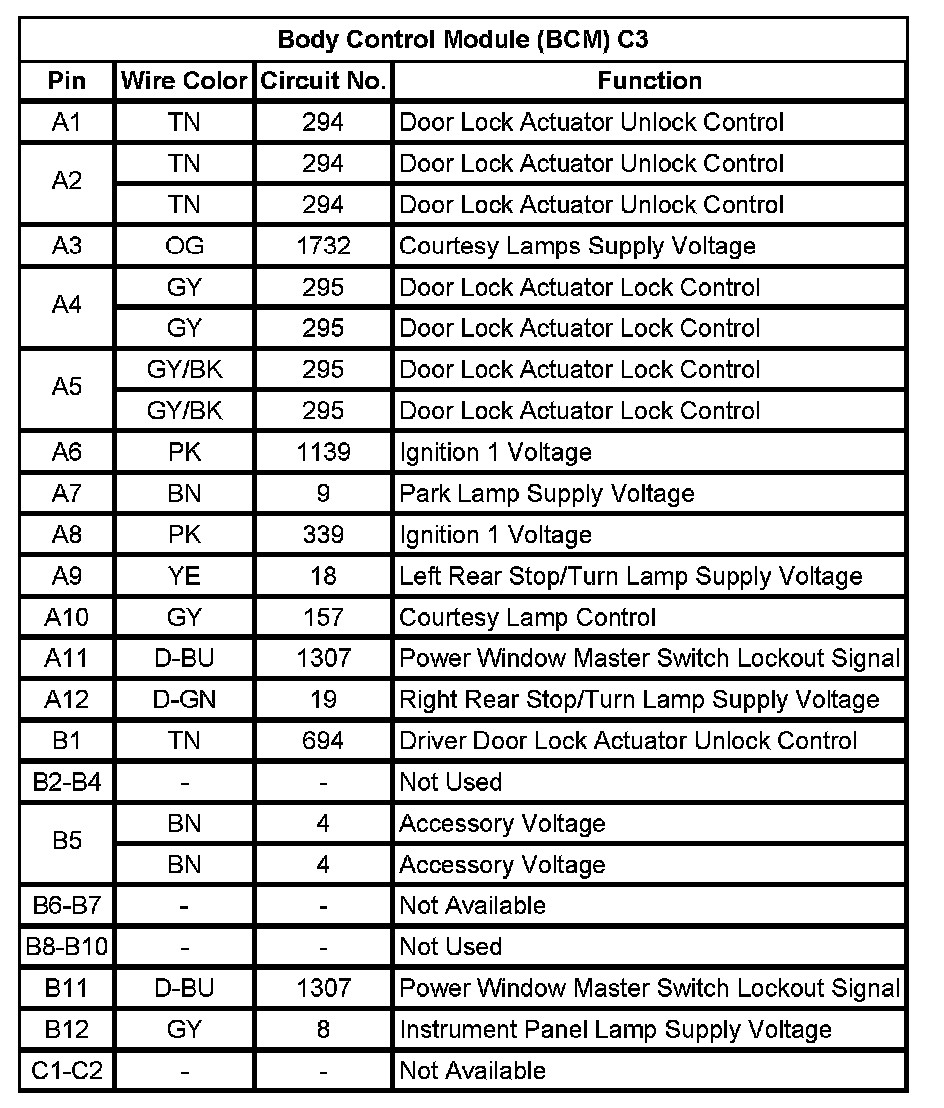 Body Control Module (BCM) C3 (Pin A1 To C2):