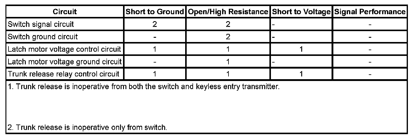 2. Test for infinite resistance between the trunk release switch supply voltage and ground terminals with the switch in the open position.