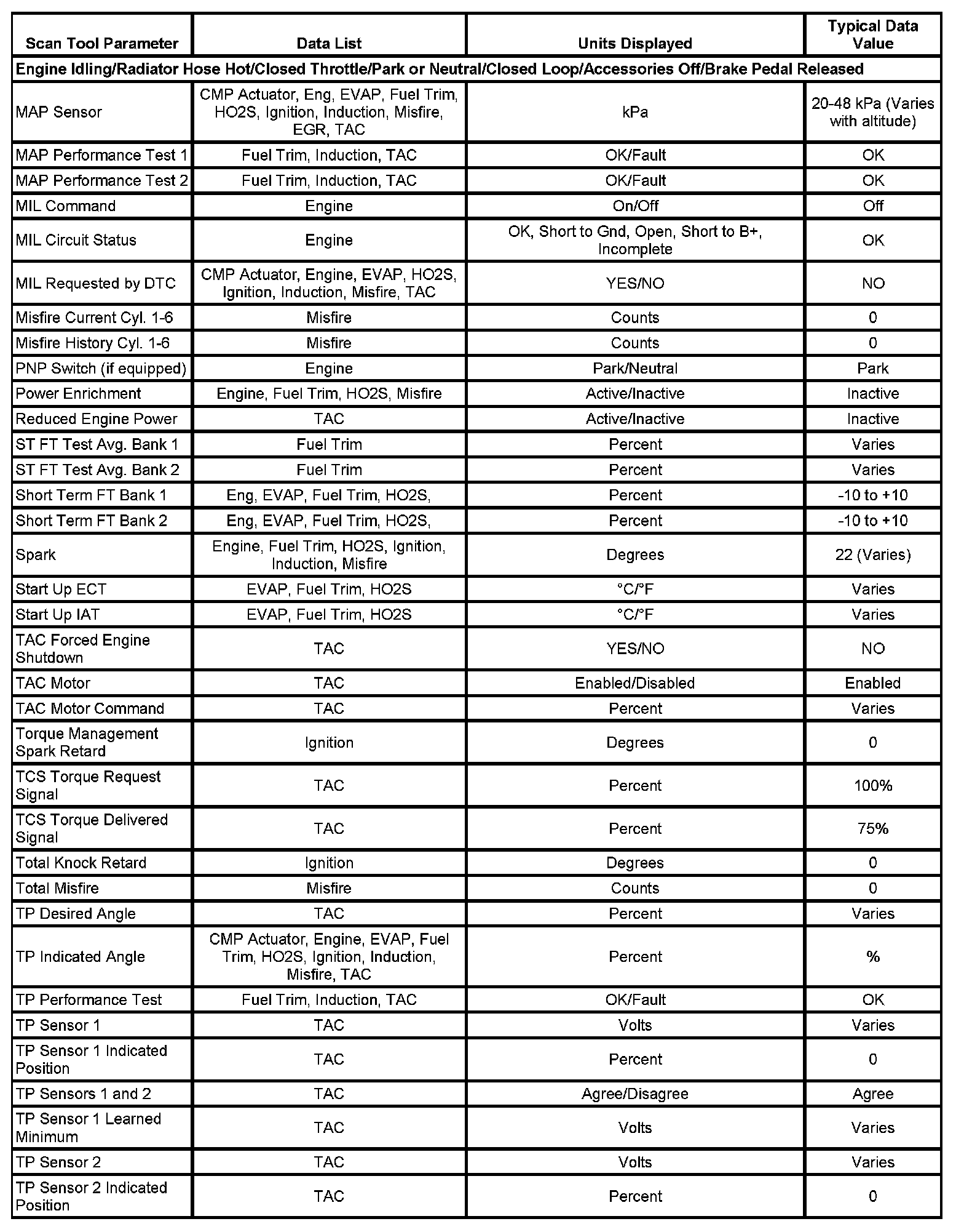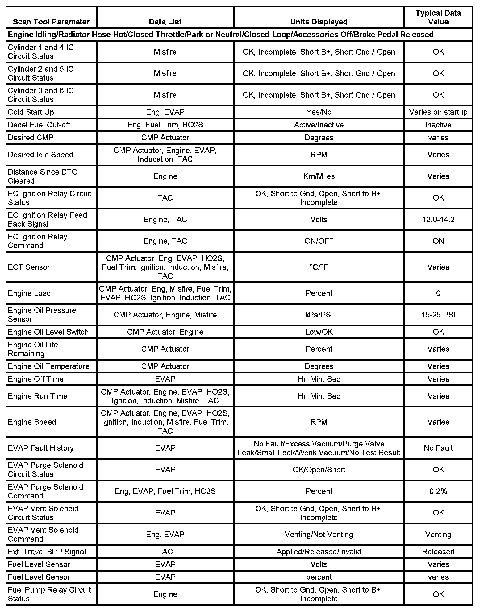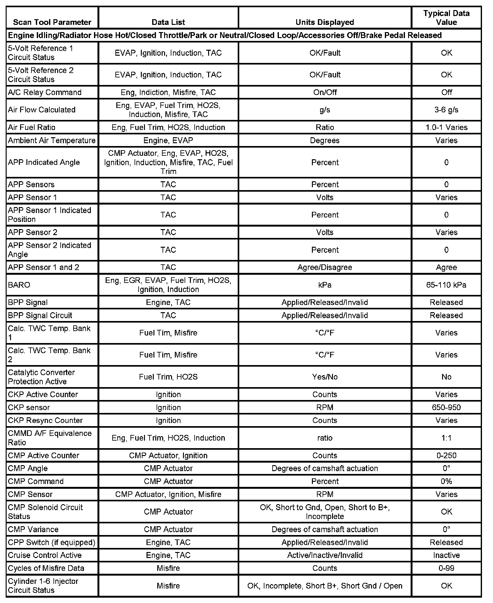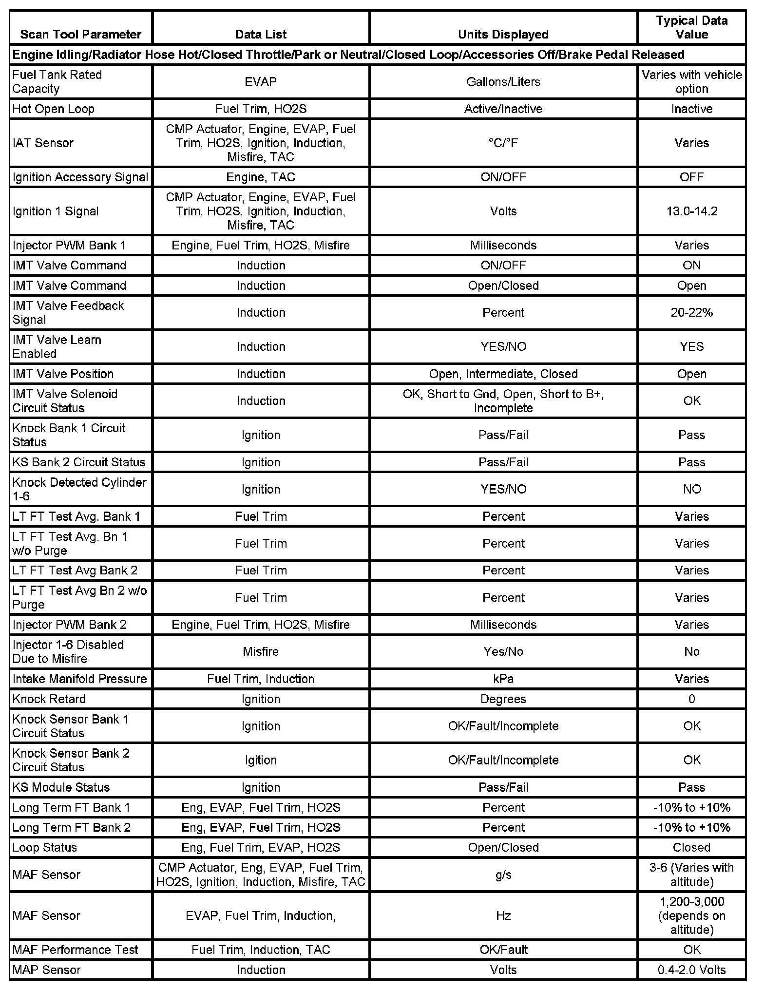 The column labeled Data List indicates where a parameter can be located on the scan tool. Refer to the scan tool operating manual for the exact locations of the data lists. The following is a description of each term listed: