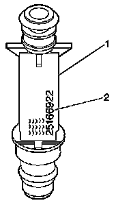 1. The fuel injector (1) is stamped with a part number identification (2).