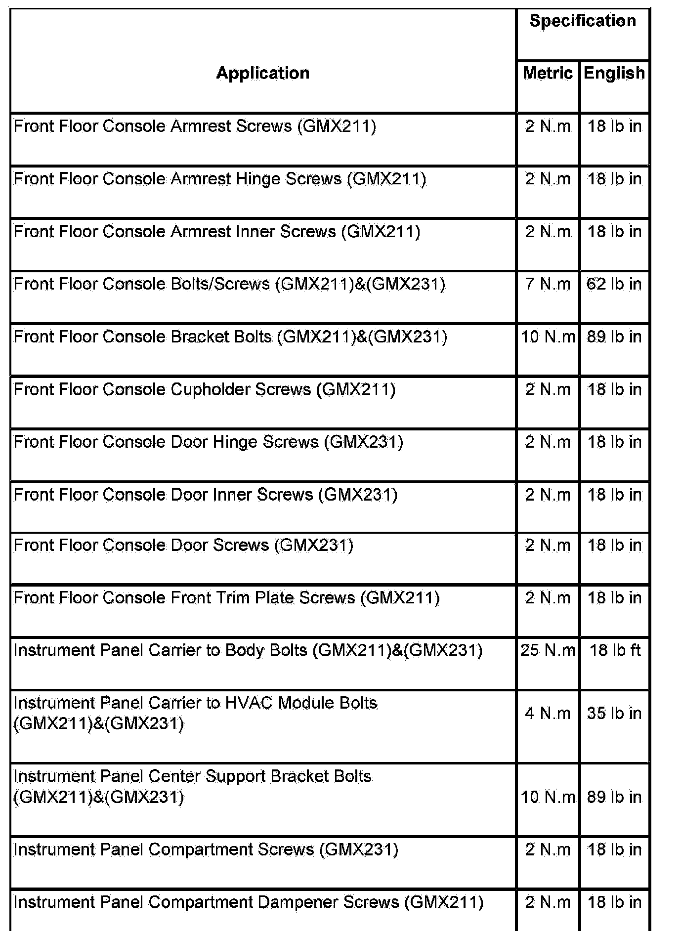 Fastener Tightening Specifications: