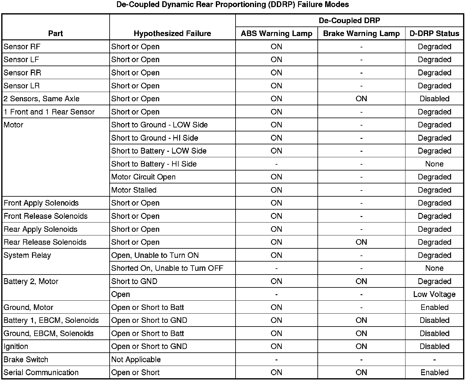 De-coupled dynamic rear proportioning (DDRP) is a proportioning system to maintain vehicle stability during braking. In normal braking condition, equal wheel speed should be maintained for efficient and balanced braking. In hard braking conditions, a vehicle requires relatively less brake force at rear wheel due to vehicle's weight transfer to the front. DDRP maintains desired brake pressure to the rear wheel by using the antilock brake system (ABS) rear inlet and outlet valve in order to provide efficient braking and vehicle stability. In the DDRP system, the power to the rear hold valve solenoid is provided from the ignition. If the following fault conditions are existing, the red brake warning lamp will be illuminated.