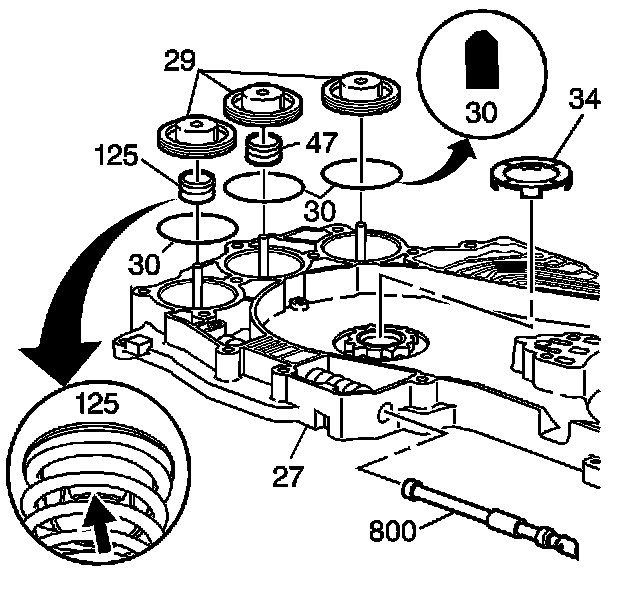Important: The 1-2 accumulator assist spring (125) has a retainer that presses into the spring. Keep the retainer and the spring together as an assembly.