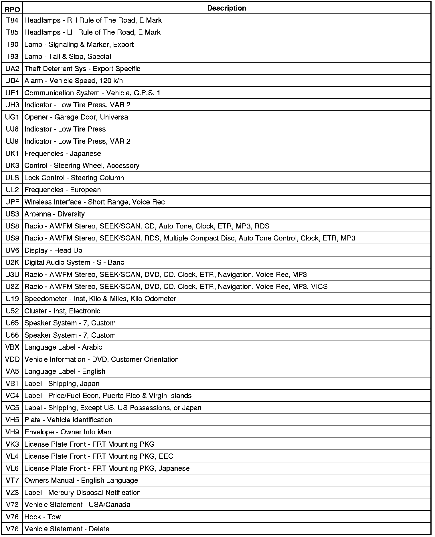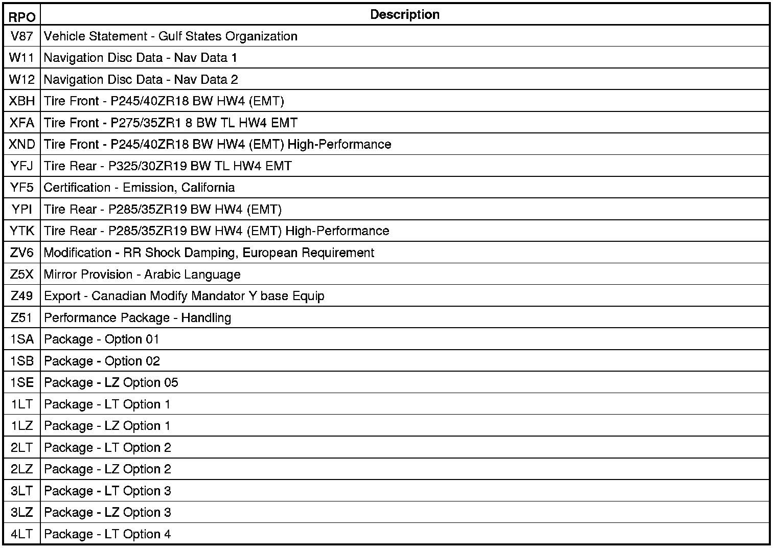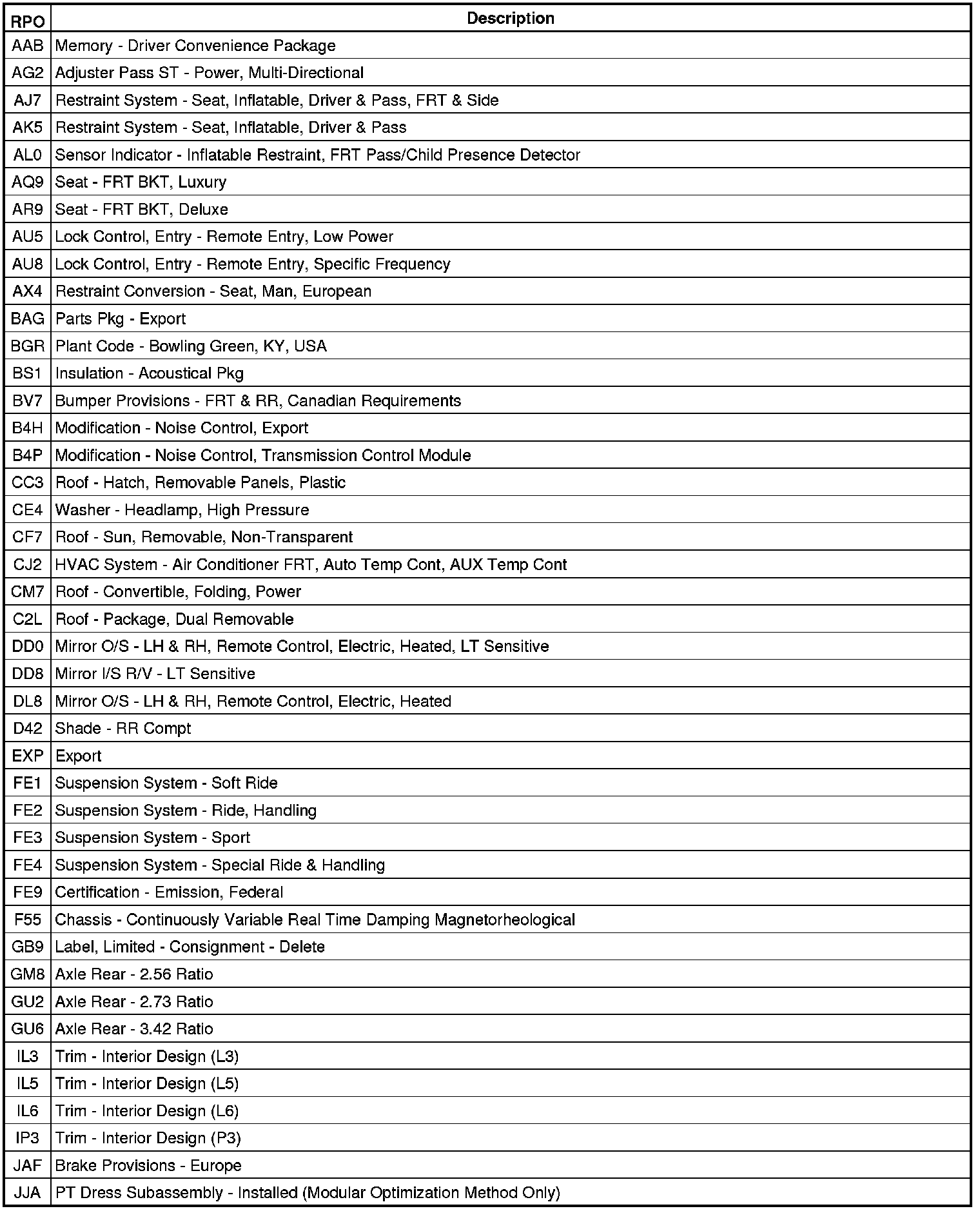 The following table provides the description of the Regular Production Option (RPO) codes that are available on the vehicle. The vehicle's RPO list is printed on the Service Parts Identification Label.