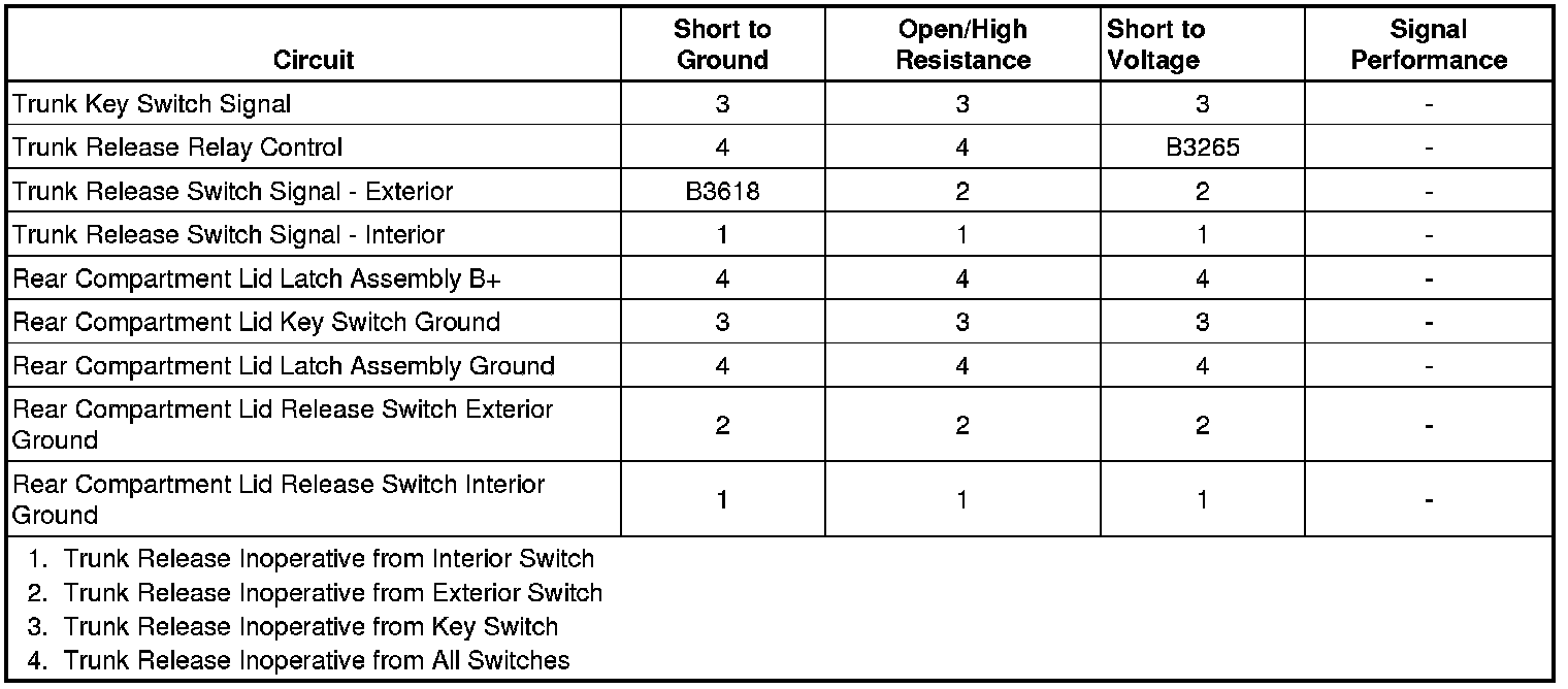 The body control module (BCM) grounds the trunk release relay control circuit based on trunk release switch signals from either the interior rear compartment lid release switch or the exterior rear compartment lid release switch. The rear compartment lid latch assembly is supplied battery voltage via the TRUNK RELEASE fuse through the TRUNK RELEASE relay. When either the interior or exterior rear compartment lid release switch is pressed, the trunk release switch signal circuit is grounded. This input will request the BCM to ground the trunk release relay control circuit, which will switch the TRUNK RELEASE relay. With the relay contacts closed, battery voltage is supplied to the rear compartment lid latch assembly, opening the rear compartment.