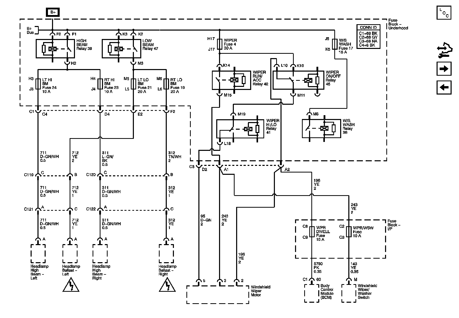WIPER, W/S WASH, LT HI BM, RT HI BM, LT LO BM, RT LO BM, WPR DWELL, WPR/WSW Fuses, and HIGH BEAM, LOW BEAM, WIPER RUN/ACC, WIPER ON/OFF, WIPER HI/LO Relays