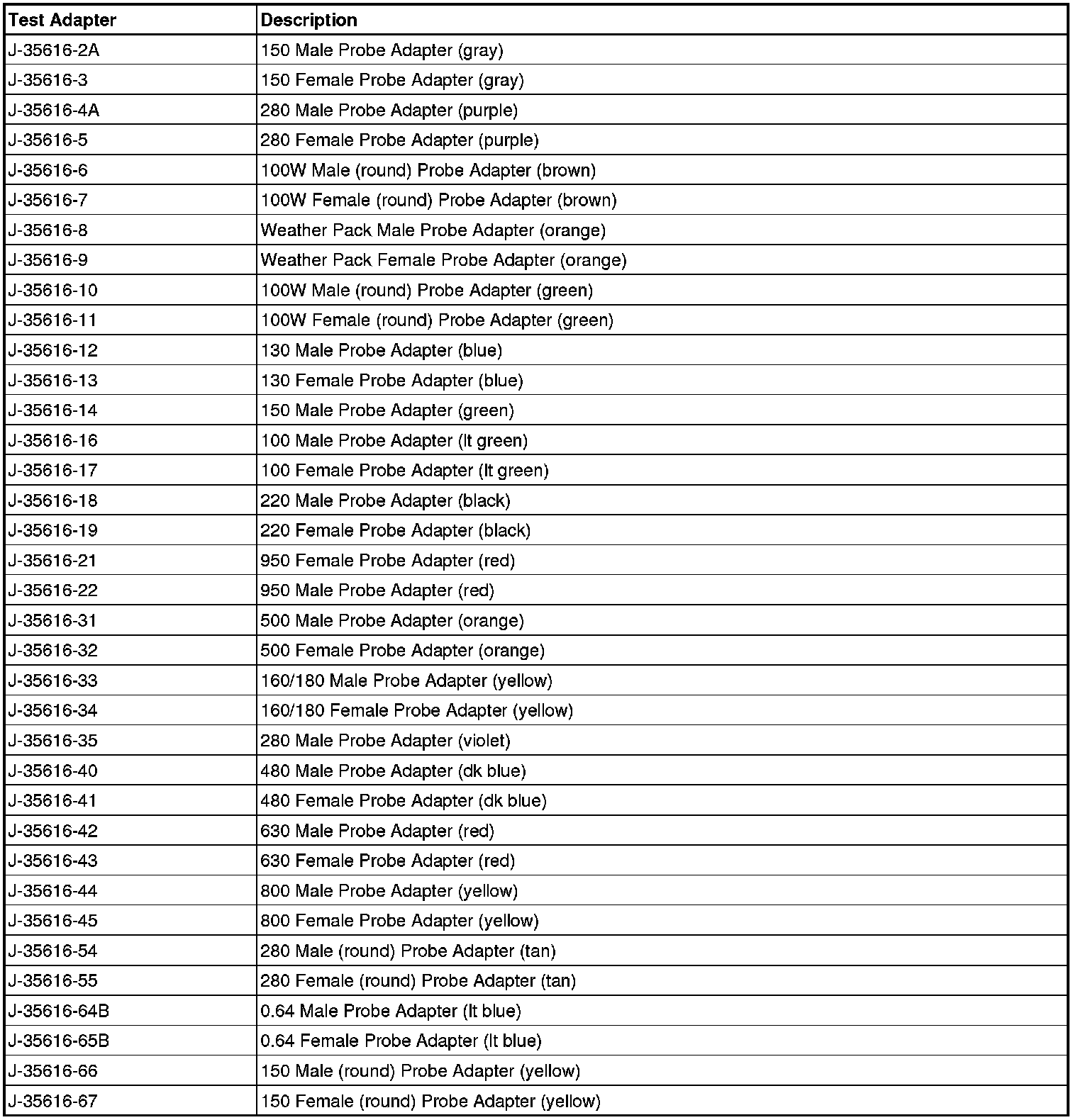 Refer to the following table as a guide in selecting the correct test adapter for frontprobing connectors: