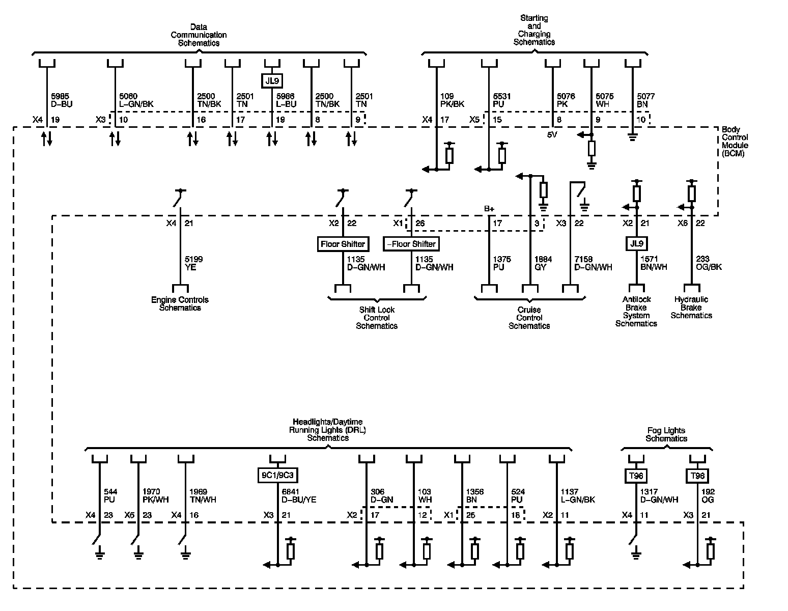 Data Link, Starting and Charging, Engine Controls, AT Shift Lock Controls, Cruise Control, ABS, Brake Warning, Headlights/DRL, and Fog Lights References