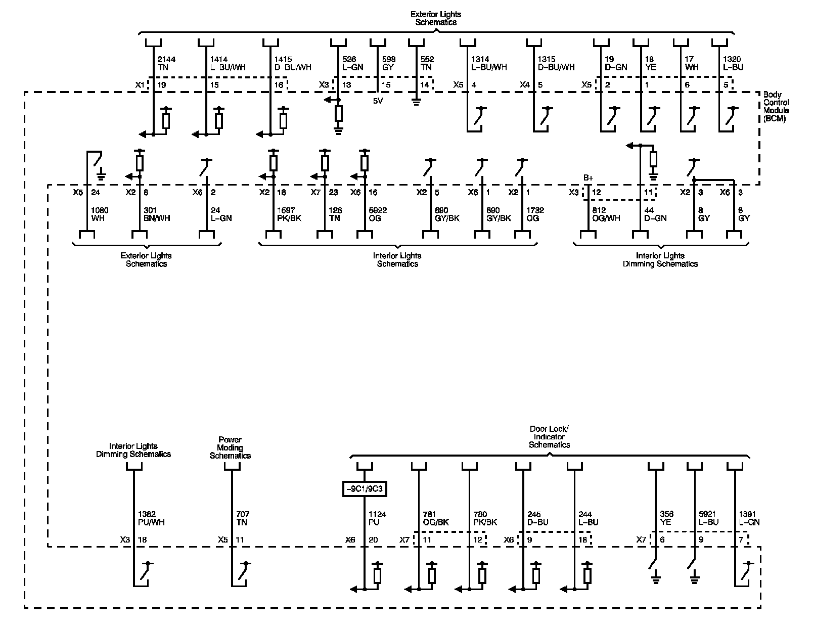 Exterior Lights, Interior Lights, Interior Lights Dimming, Power Moding, and Door Lock/Indicator References