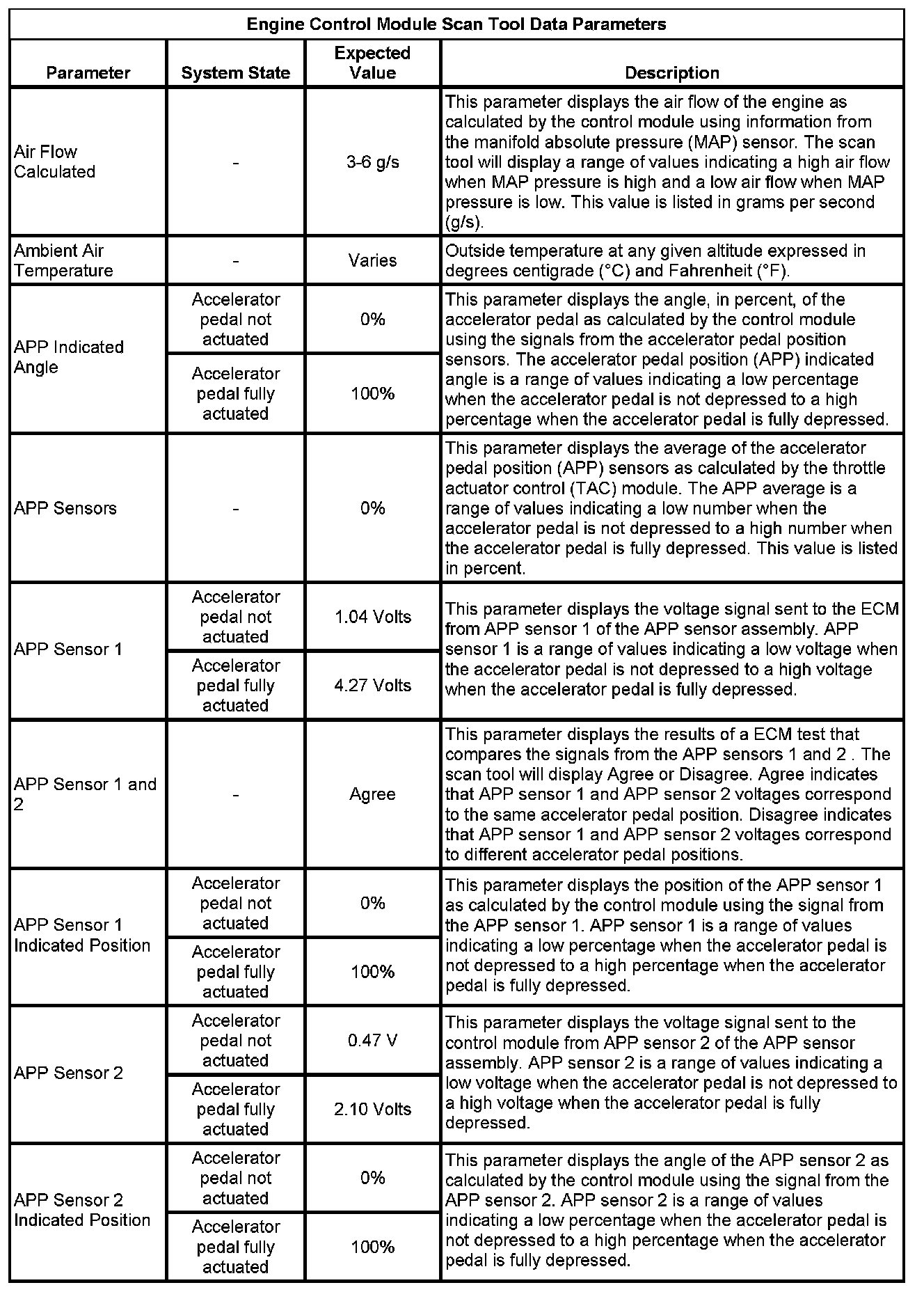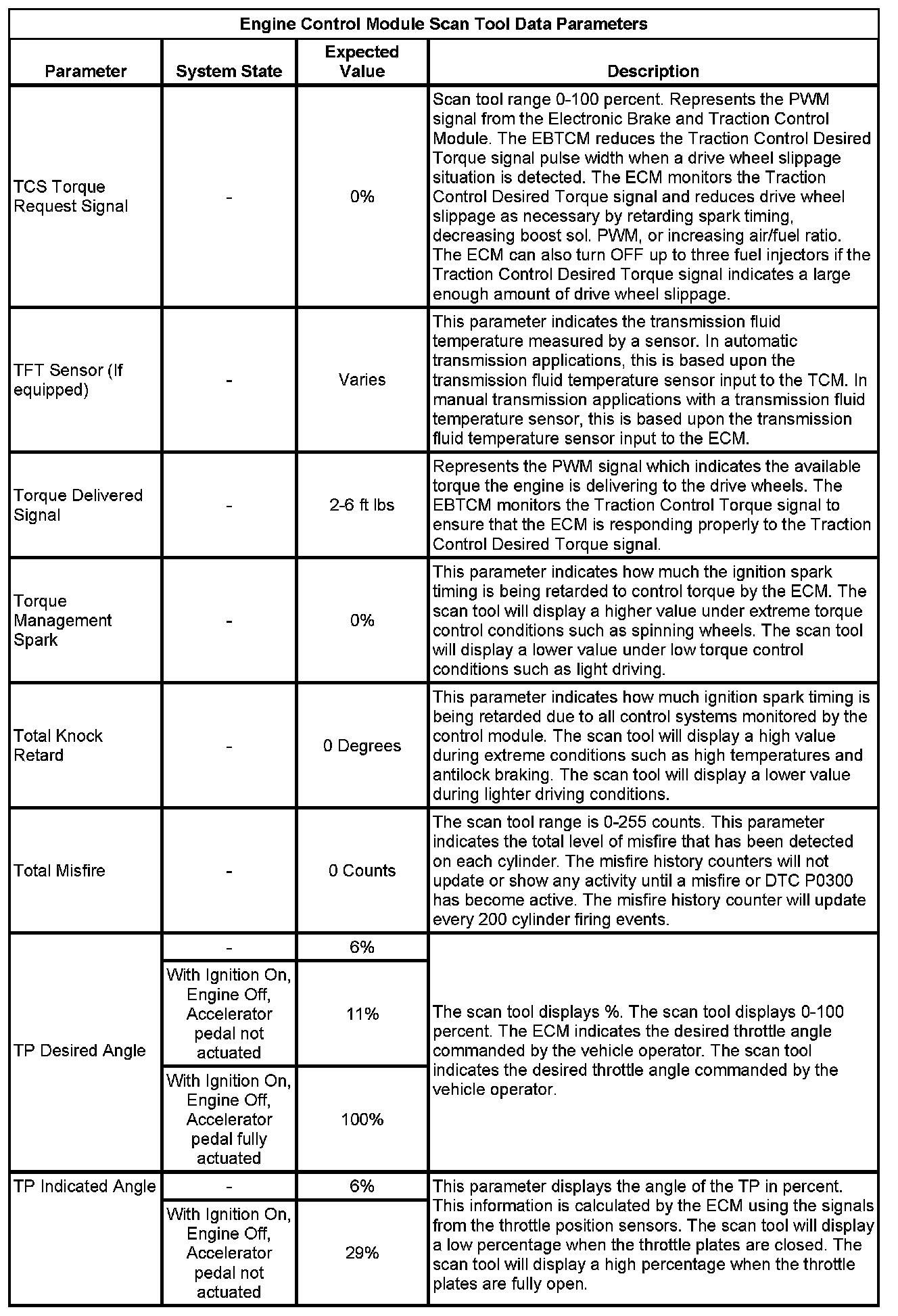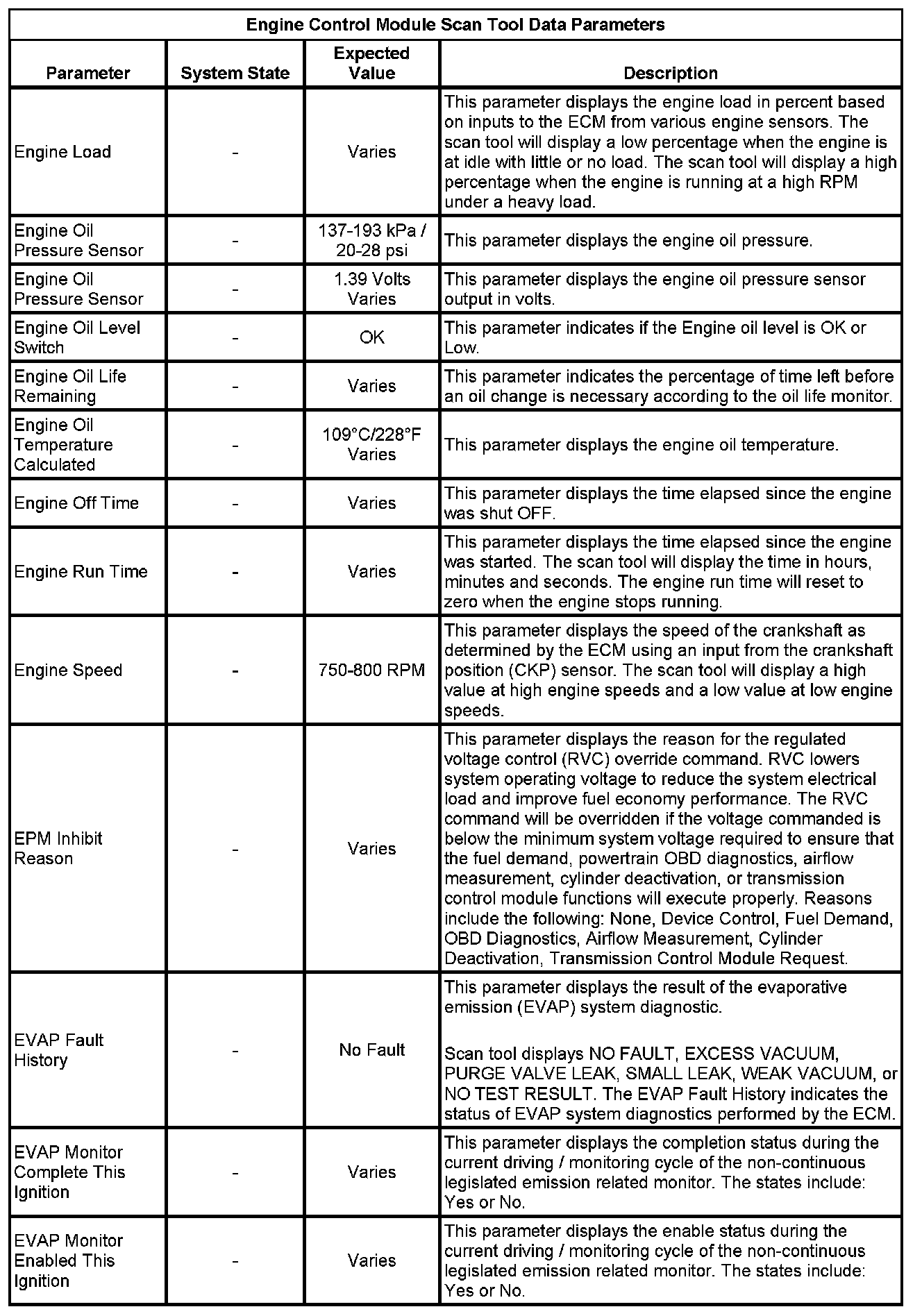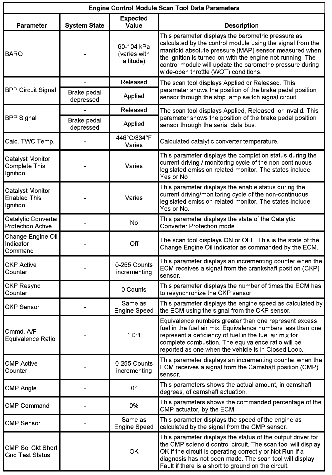 The Engine Control Module Scan Tool Data List contains all engine-related parameters that are available on the scan tool. The list is arranged in alphabetical order. A given parameter may appear in any one of the data lists, and in some cases may appear more than once, or in more than one data list in order to group certain related parameters together.