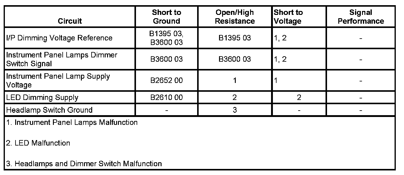 The body control module (BCM) supplies a voltage reference through the instrument panel (I/P) dimming voltage reference circuit to the interior lamp dimmer switch, which is part of the headlamp switch. When the dimmer switch is placed in a desired brightness position, reference voltage is applied through the dimmer switch rheostat and the I/P lamps dimmer switch signal circuit to the BCM. The BCM interprets this voltage signal, then applies a pulse width modulated (PWM) voltage from the CHMSL/BCK-UP fuse through the instrument panel lamp supply voltage circuit, the backlight lamp control circuit, and the LED dimming supply circuit illuminating the LED and I/P panel lamps.