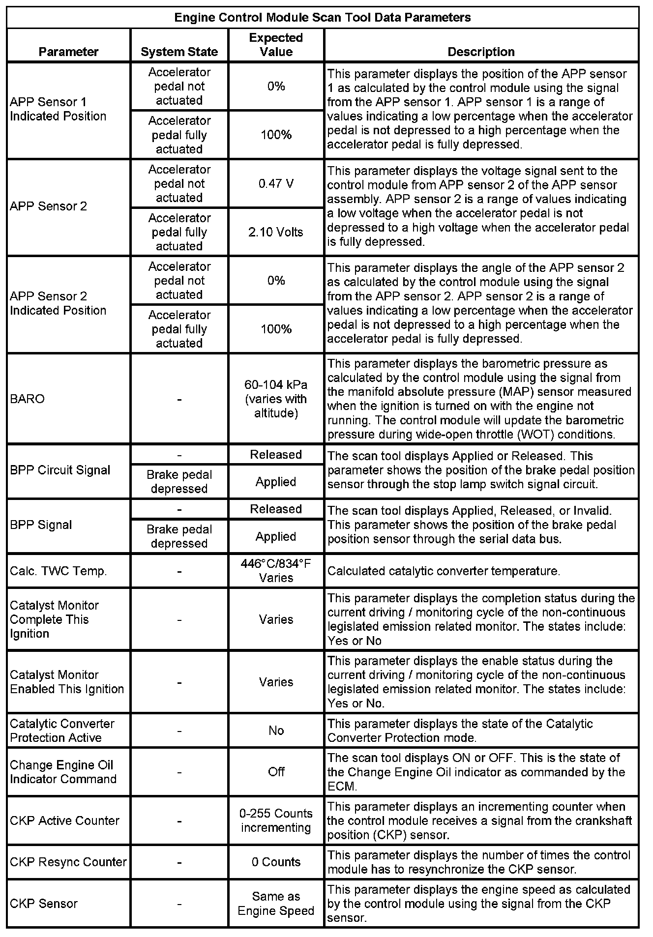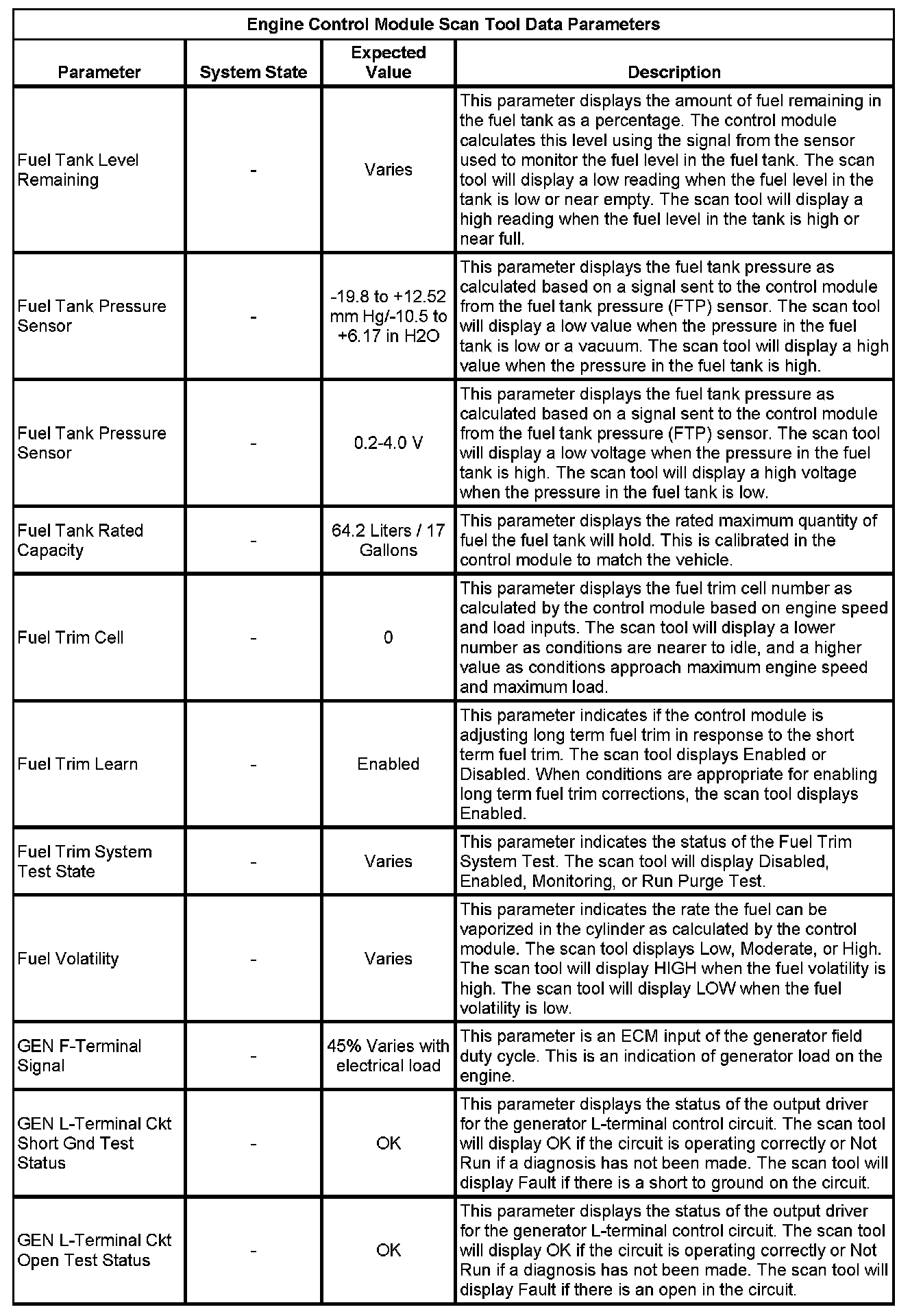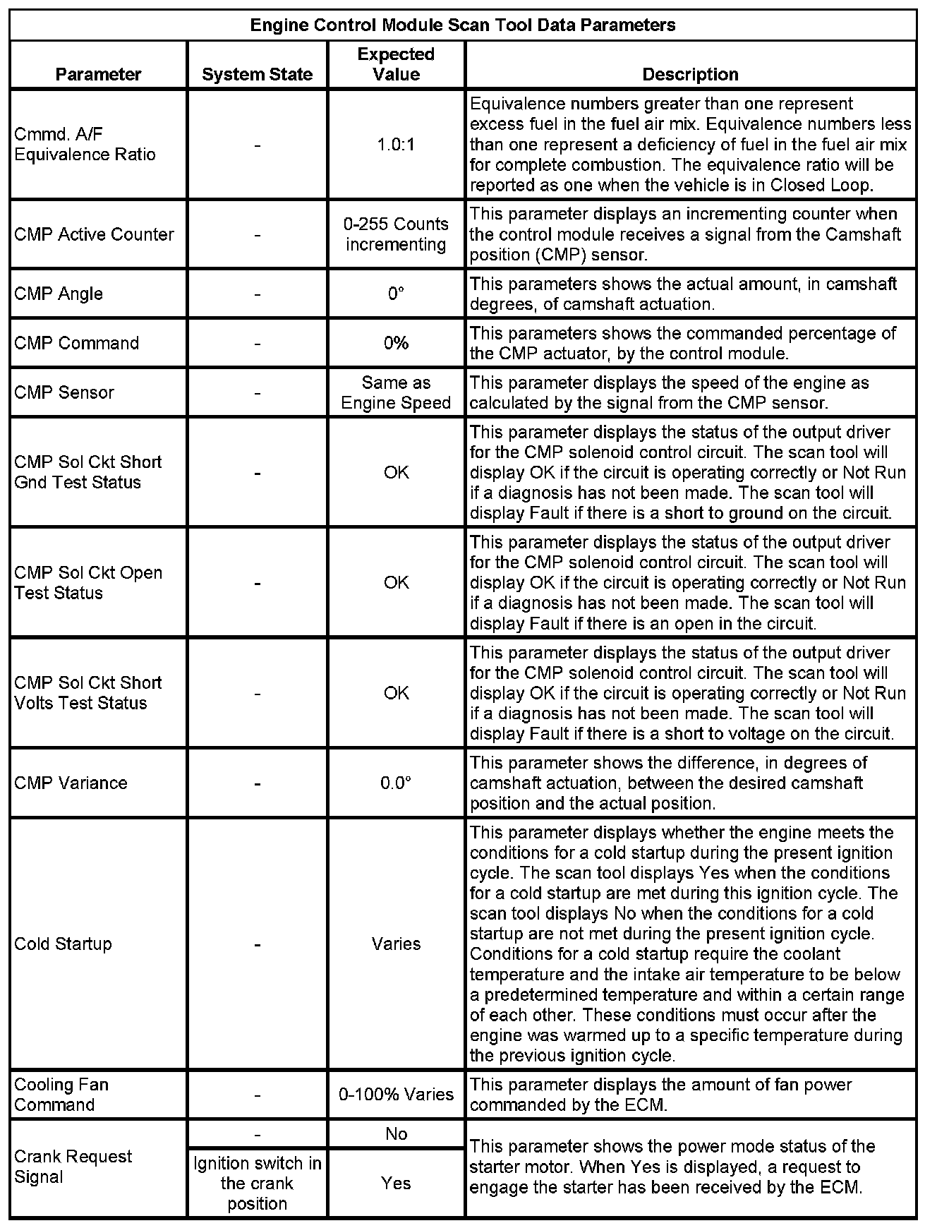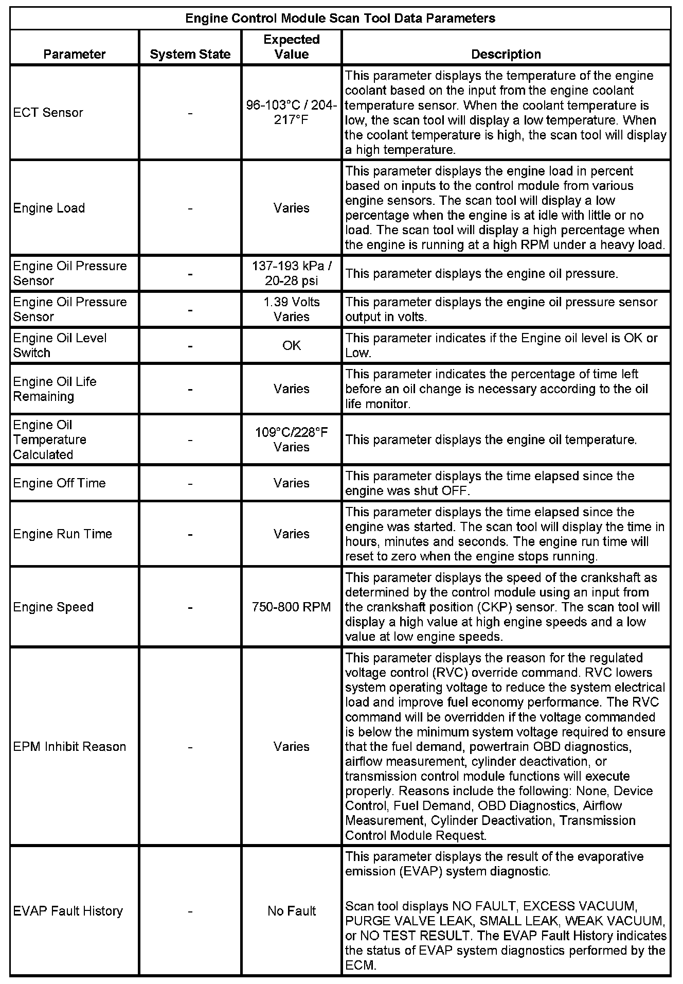 The Engine Control Module Scan Tool Data List contains all engine-related parameters that are available on the scan tool. The list is arranged in alphabetical order. A given parameter may appear in any one of the data lists, and in some cases may appear more than once, or in more than one data list in order to group certain related parameters together.