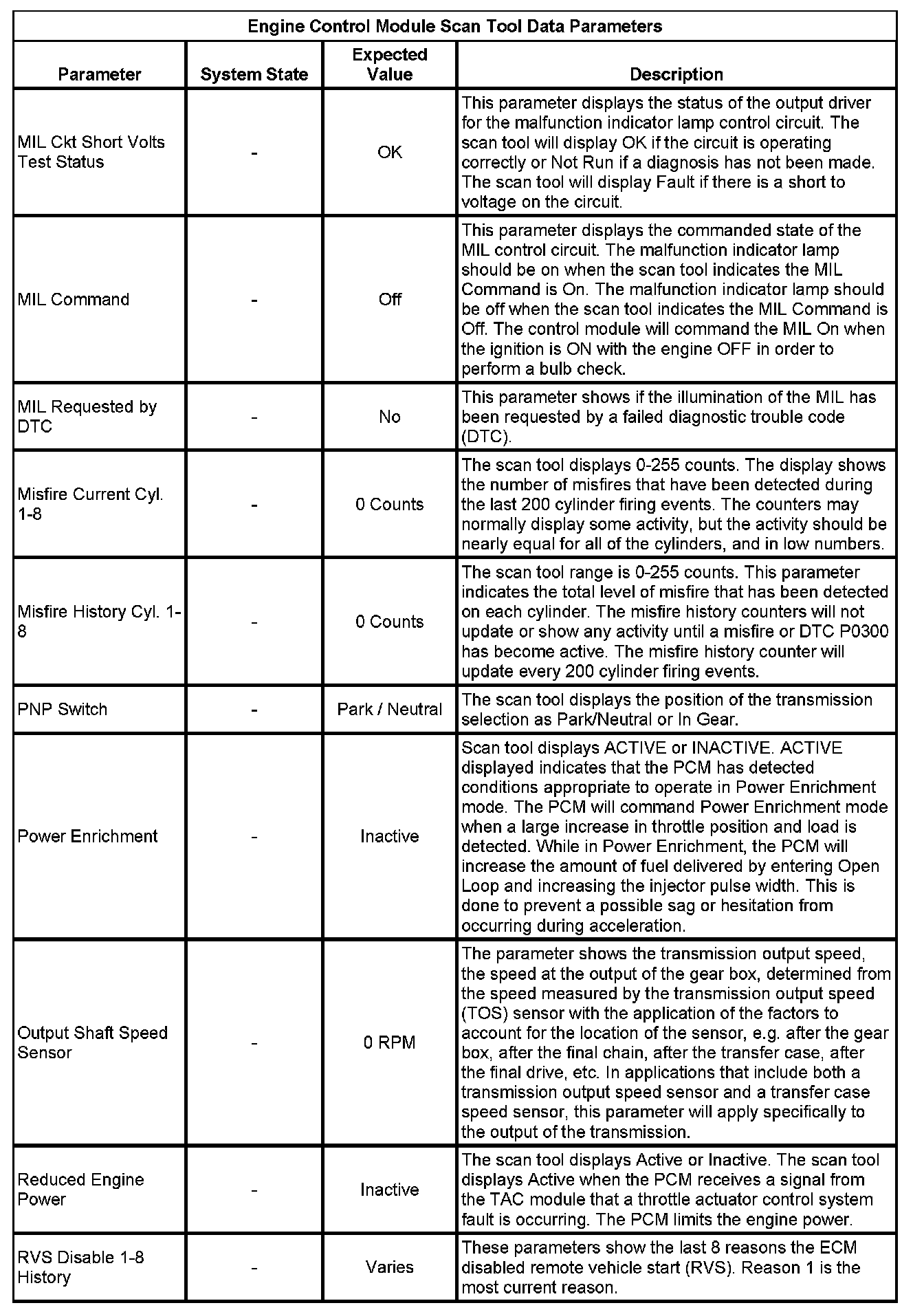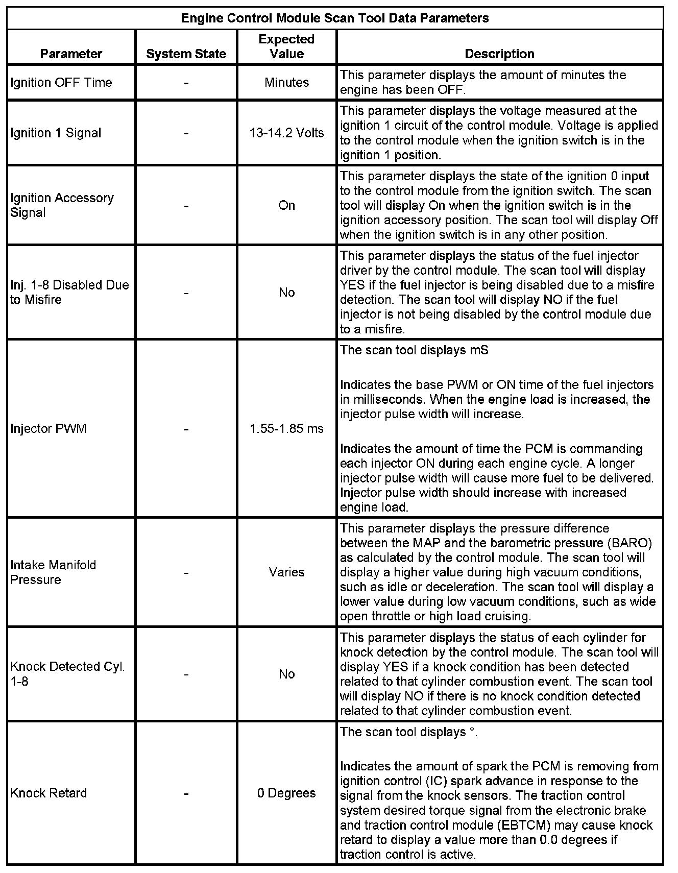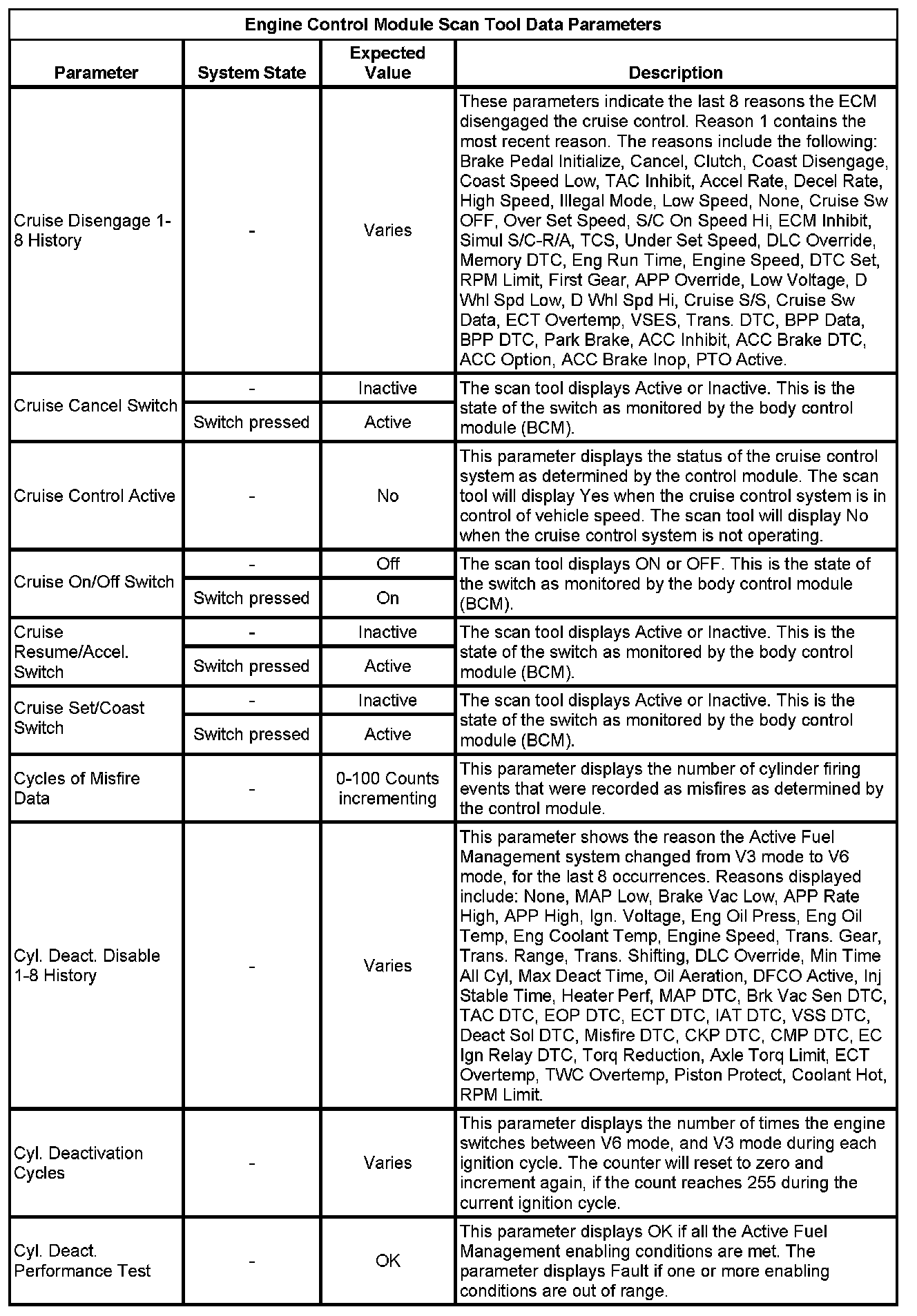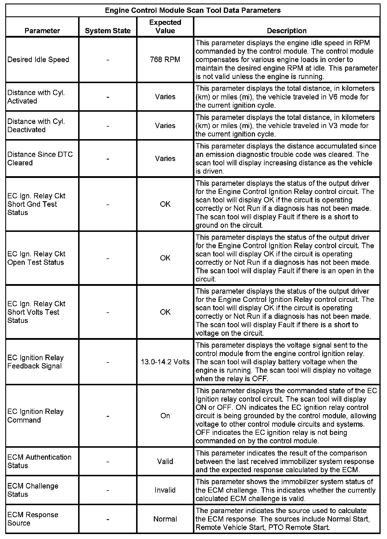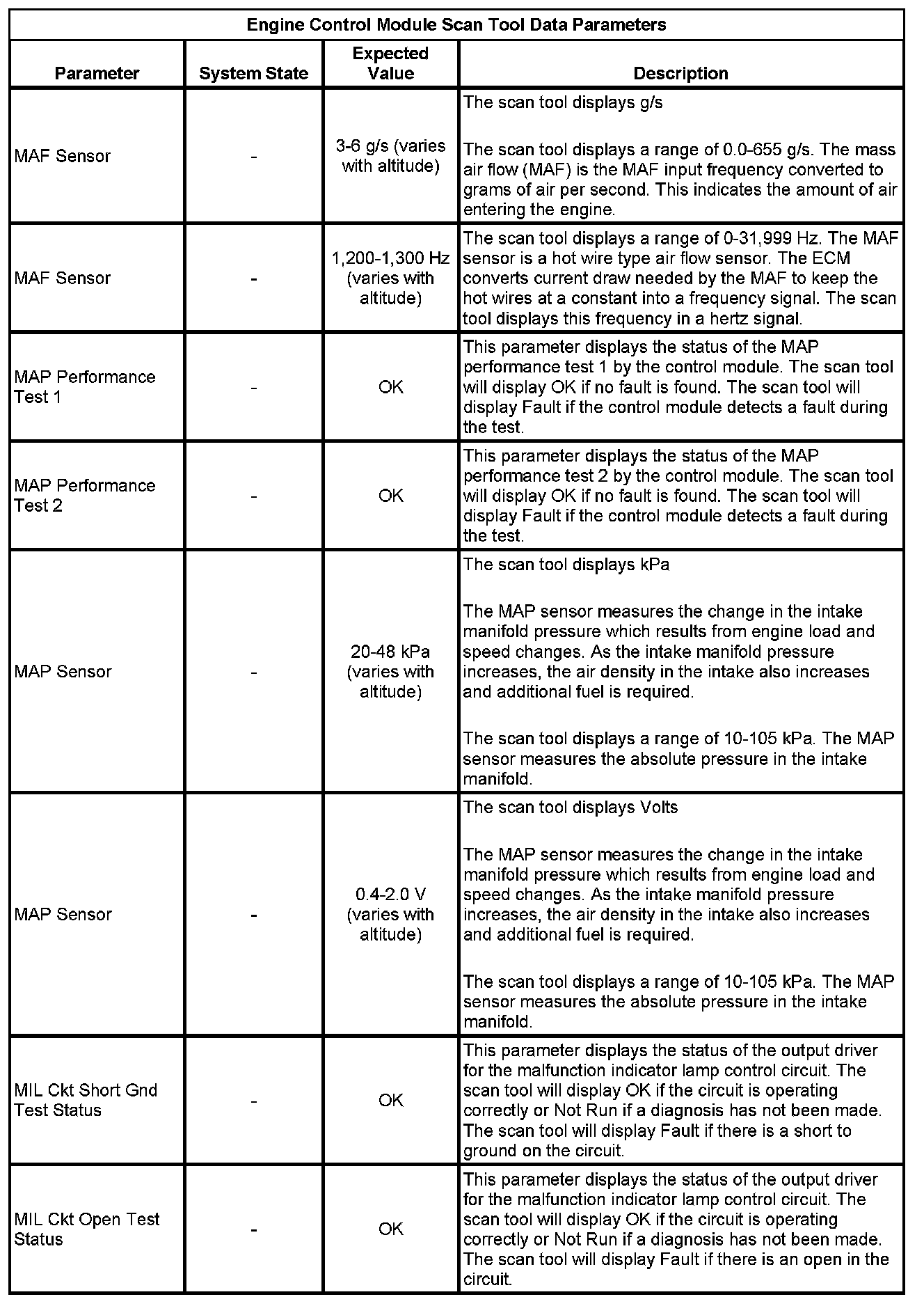The Engine Control Module Scan Tool Data List contains all engine-related parameters that are available on the scan tool. The list is arranged in alphabetical order. A given parameter may appear in any one of the data lists, and in some cases may appear more than once, or in more than one data list in order to group certain related parameters together.
