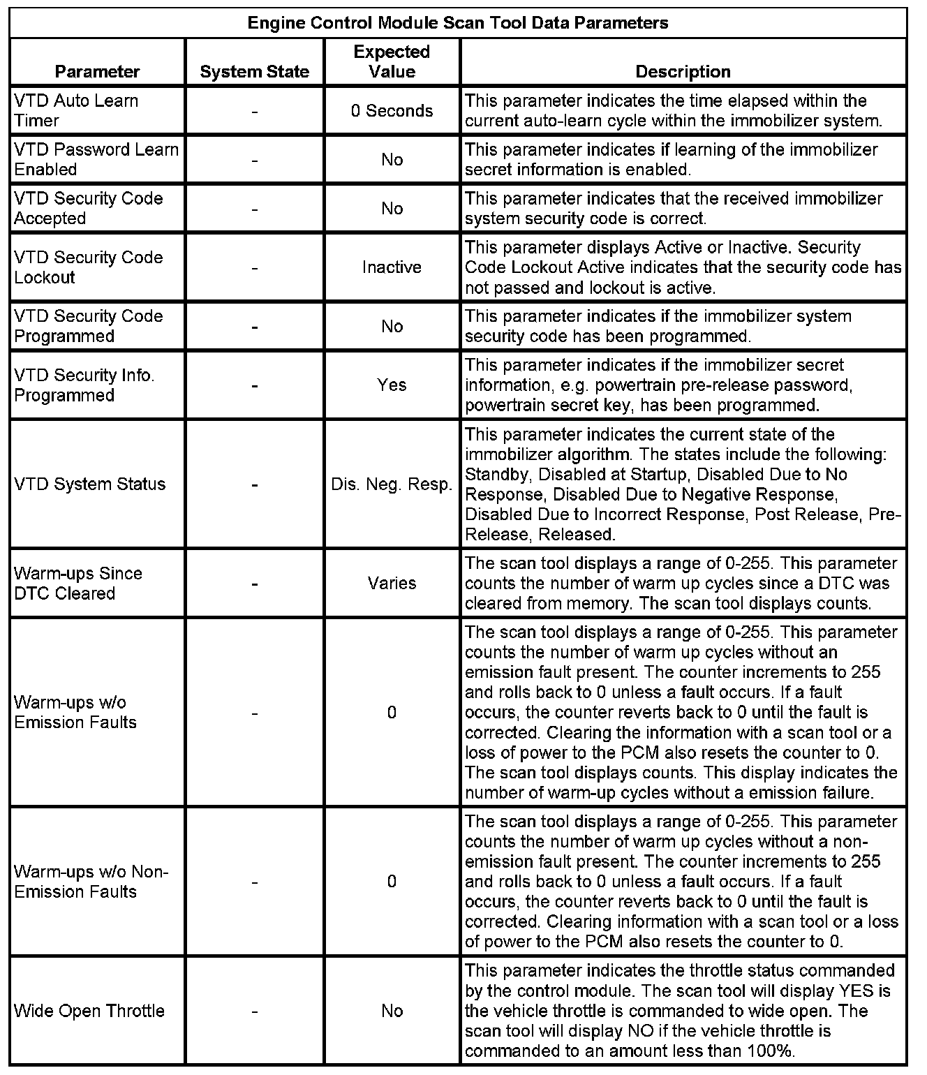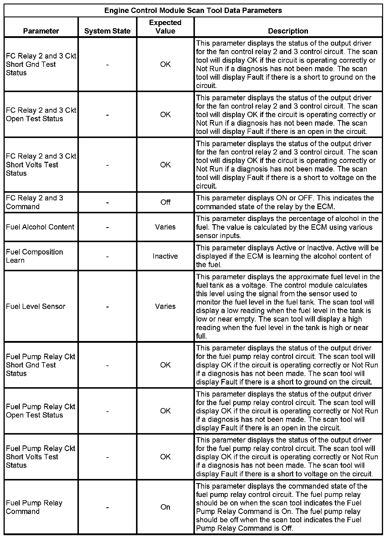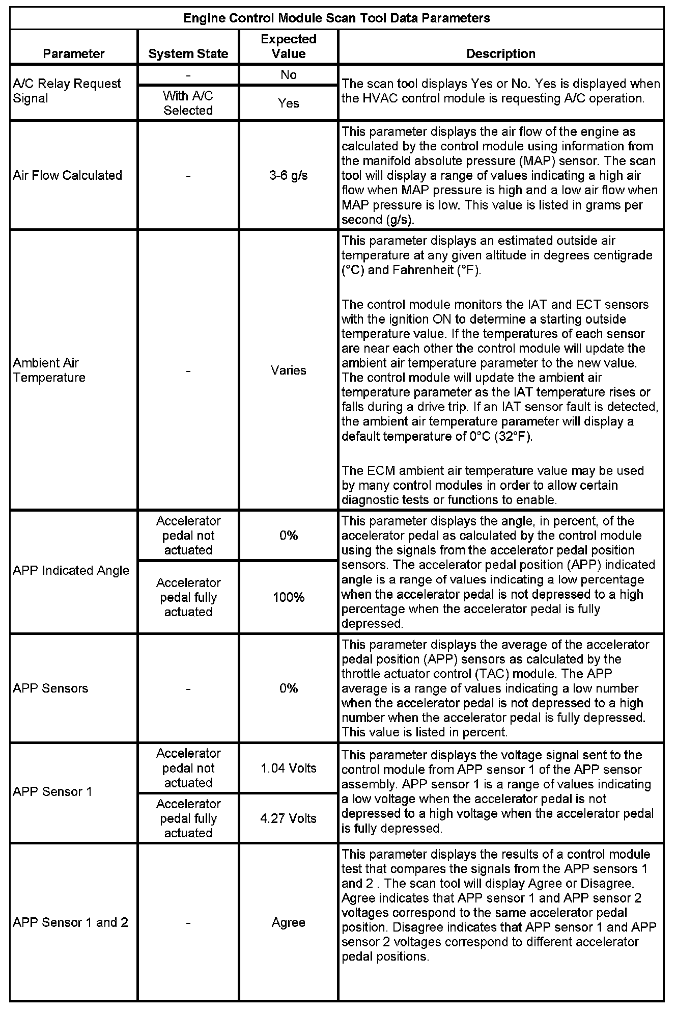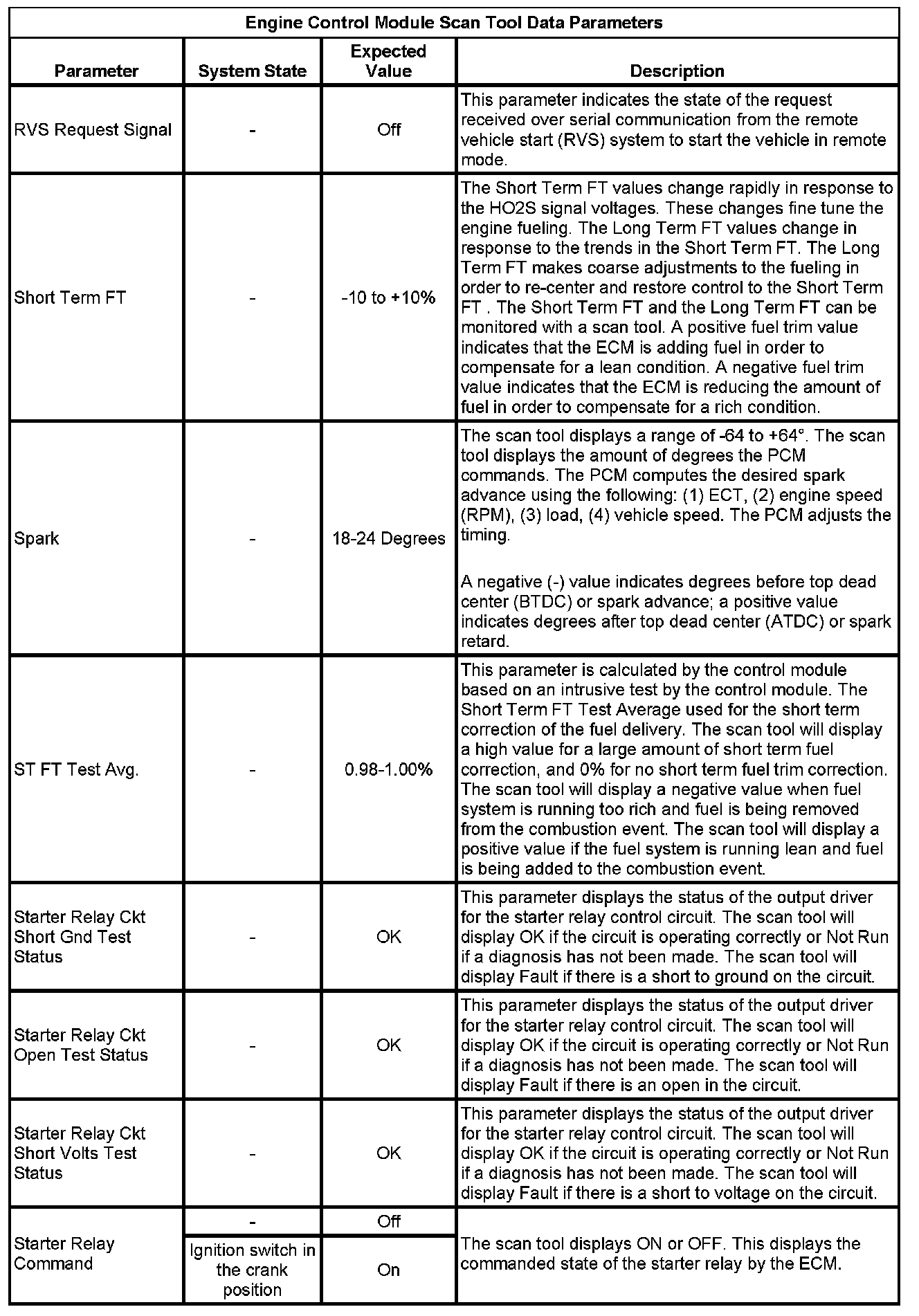 The Engine Control Module Scan Tool Data List contains all engine-related parameters that are available on the scan tool. The list is arranged in alphabetical order. A given parameter may appear in any one of the data lists, and in some cases may appear more than once, or in more than one data list in order to group certain related parameters together.