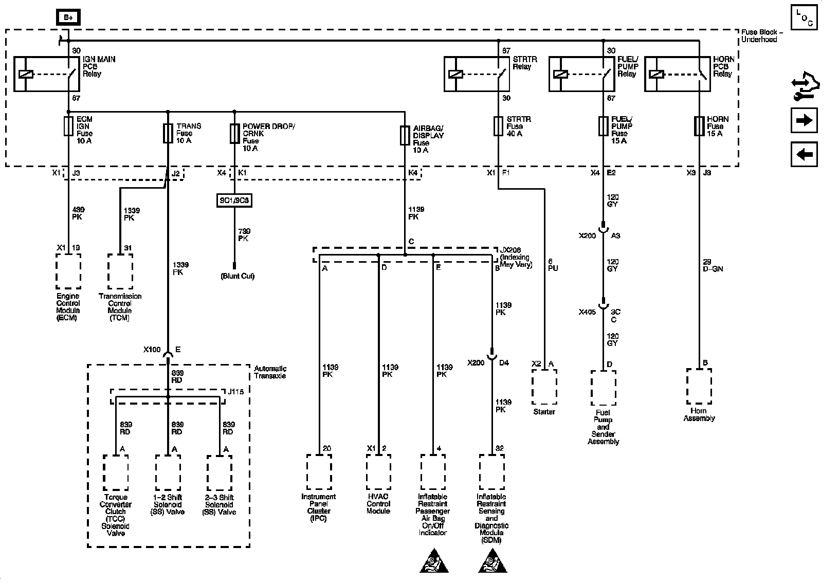 ECM IGN, TRANS, PWR DROP/CRNK, AIRBAG/DISPLAY, STRTR, FUEL/PUMP, and HORN Fuses
