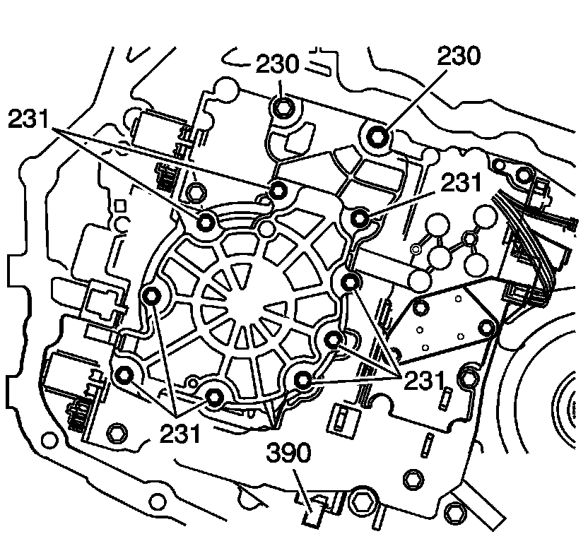 1. Remove the eleven indicated oil pump bolts (230, 231).