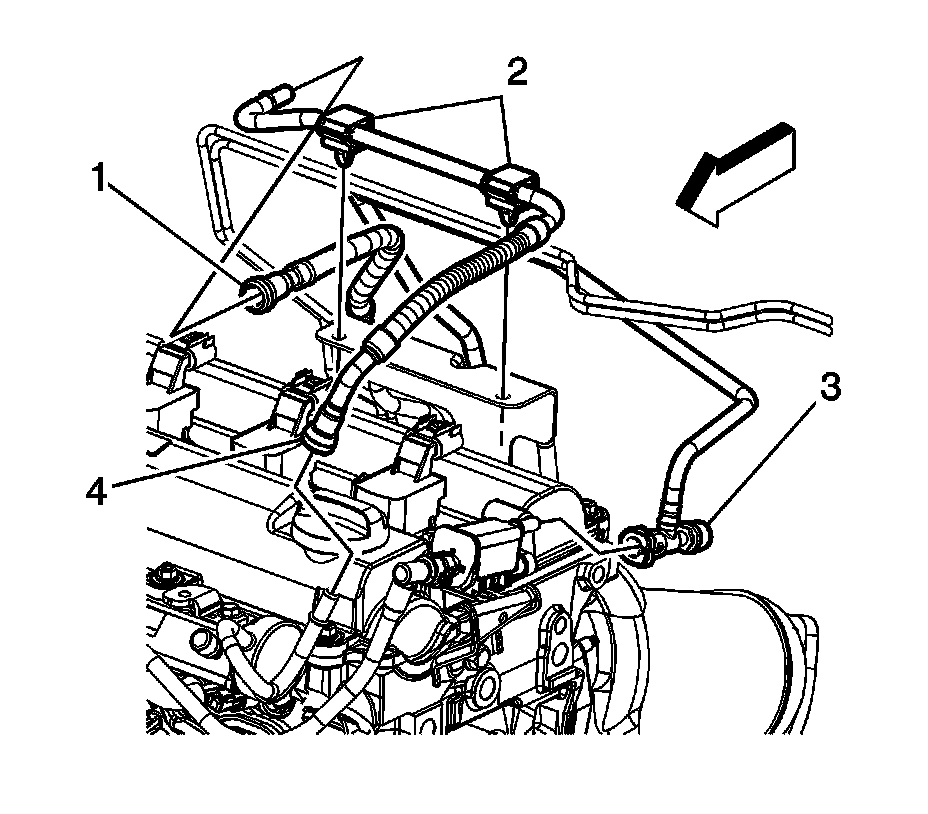 3. Disconnect the fuel feed line quick connect fitting (4) from the fuel rail.