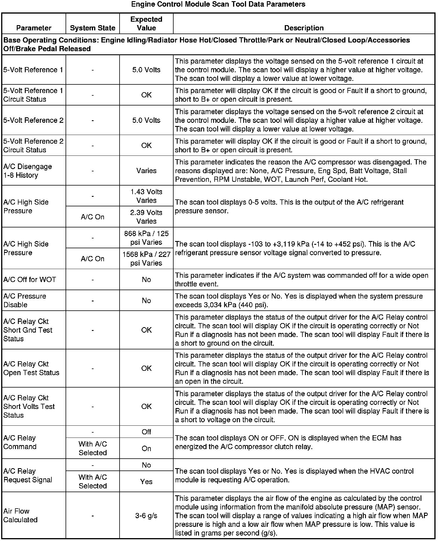 The Engine Control Module Scan Tool Data List contains all engine-related parameters that are available on the scan tool. The list is arranged in alphabetical order. A given parameter may appear in any one of the data lists, and in some cases may appear more than once, or in more than one data list in order to group certain related parameters together.