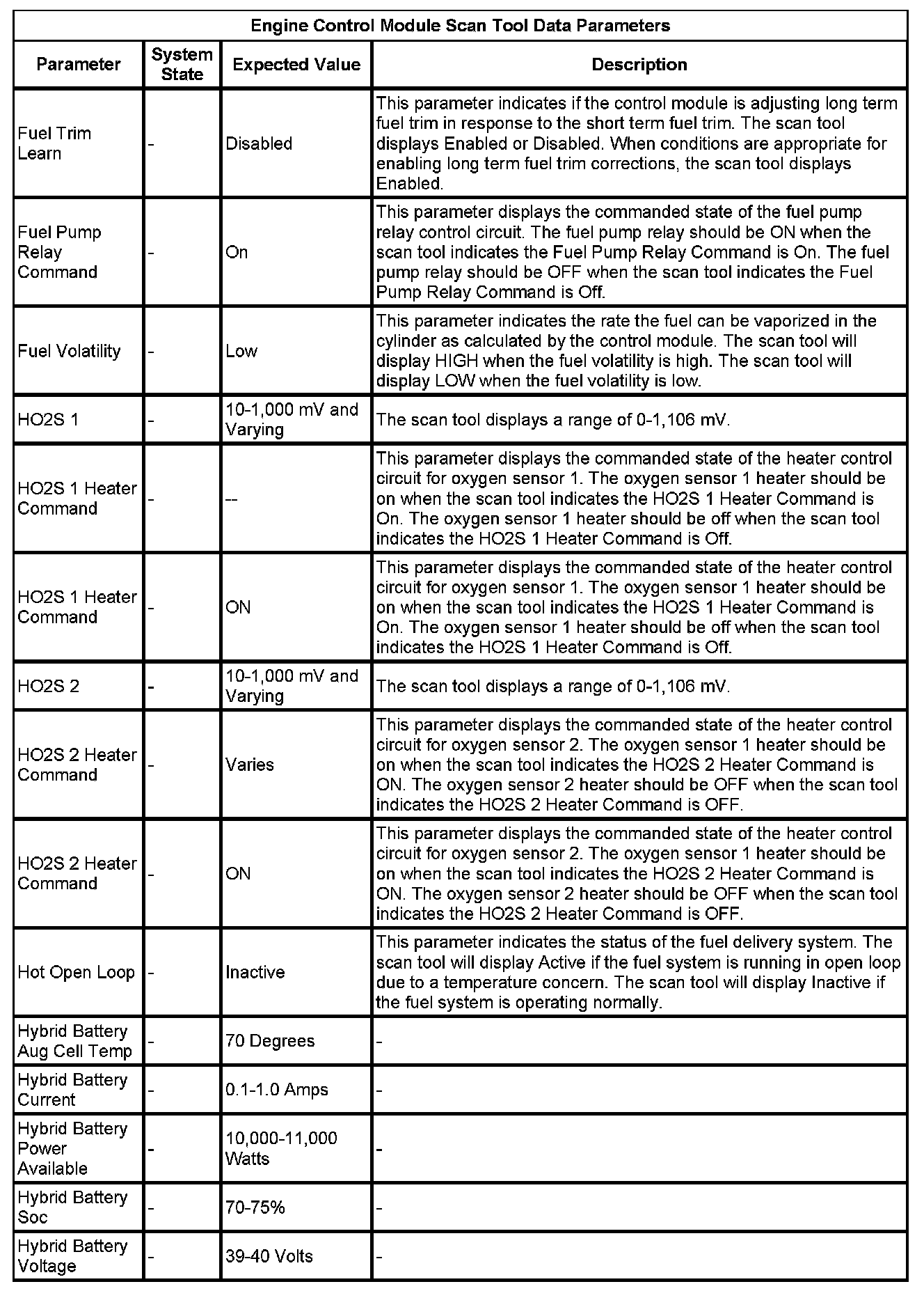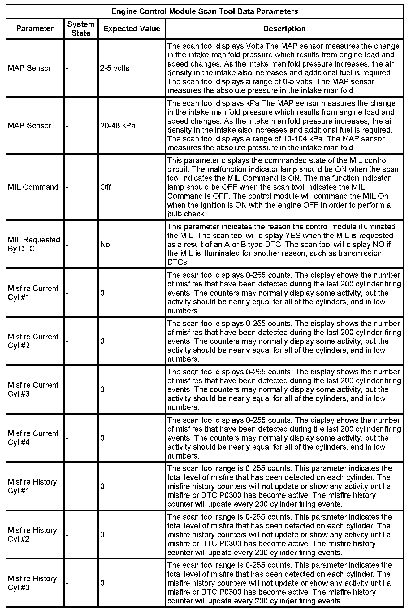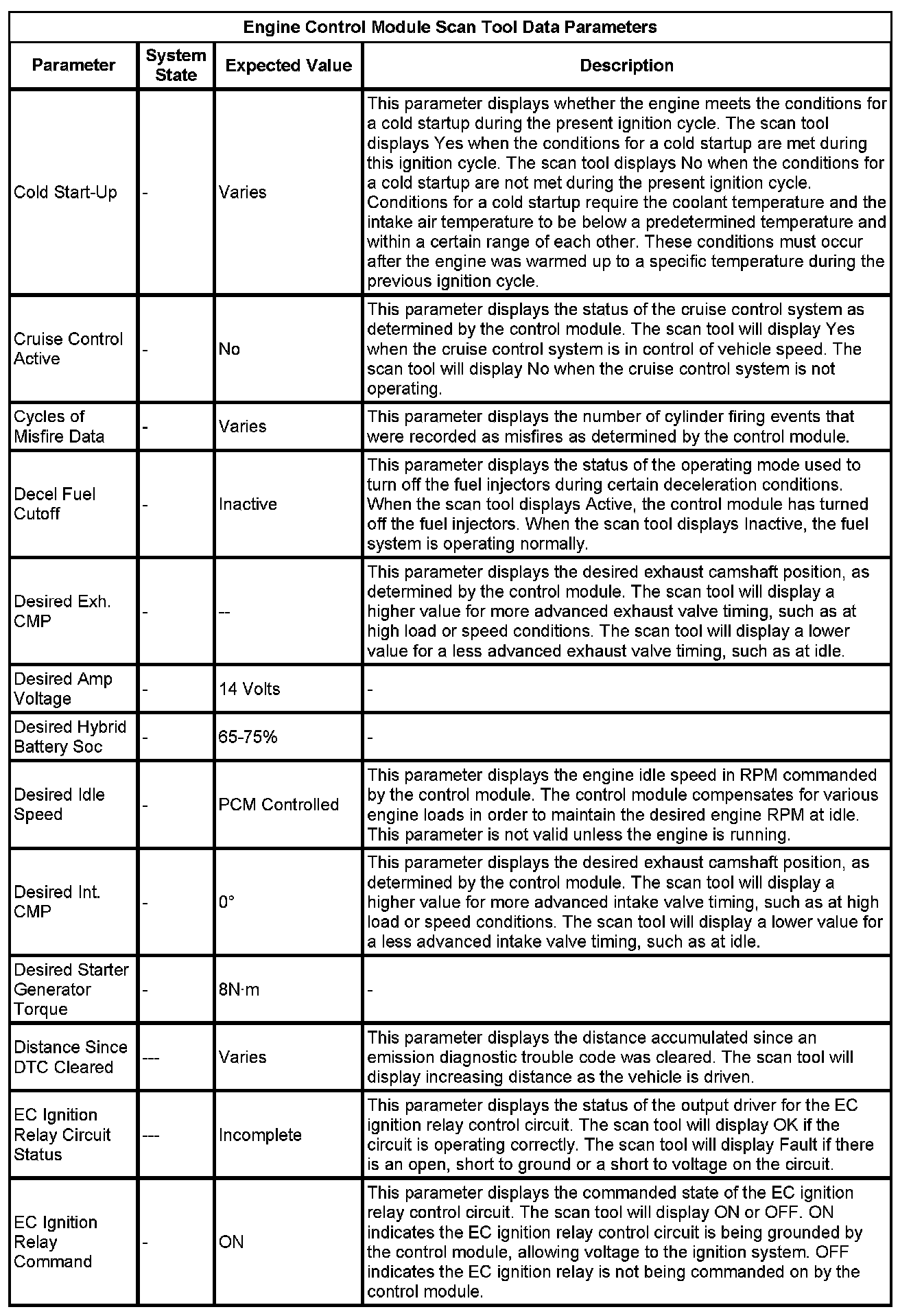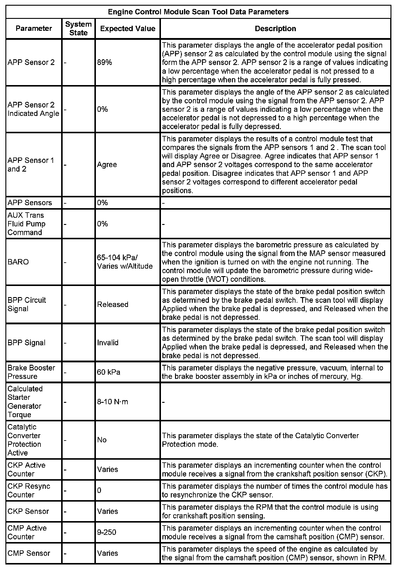 The Engine Scan Tool Data List contains all engine related parameters that are available on the scan tool. The list is arranged in alphabetical order.