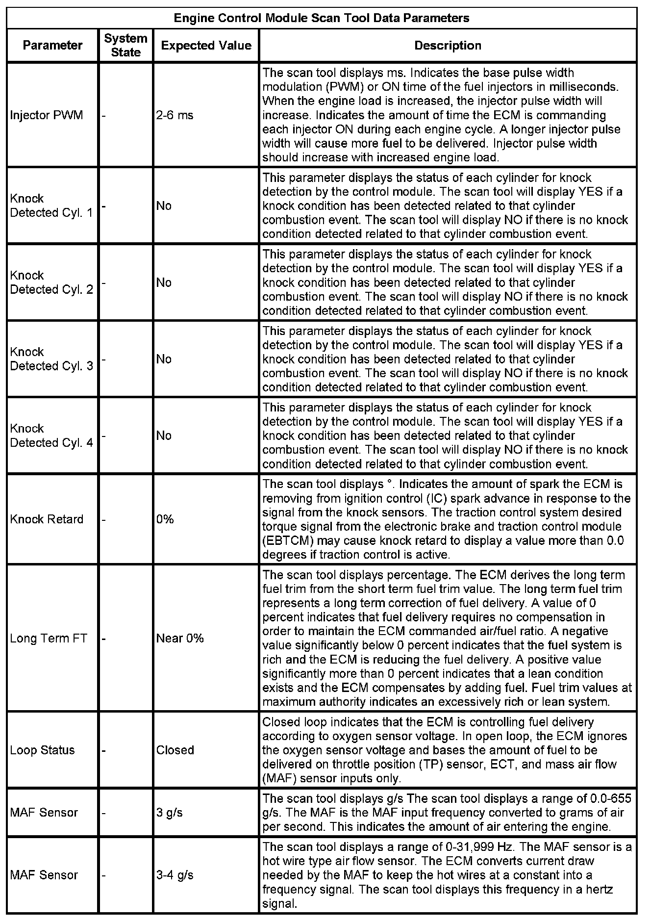 Scan tool values from a properly running engine may be used for comparison with the engine you are diagnosing. The Engine Scan Tool Data List represents values that would be seen on a normal running engine.