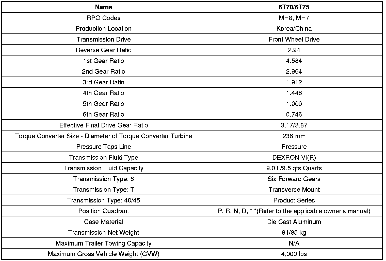 Transmission General Specifications (6T40/45)
