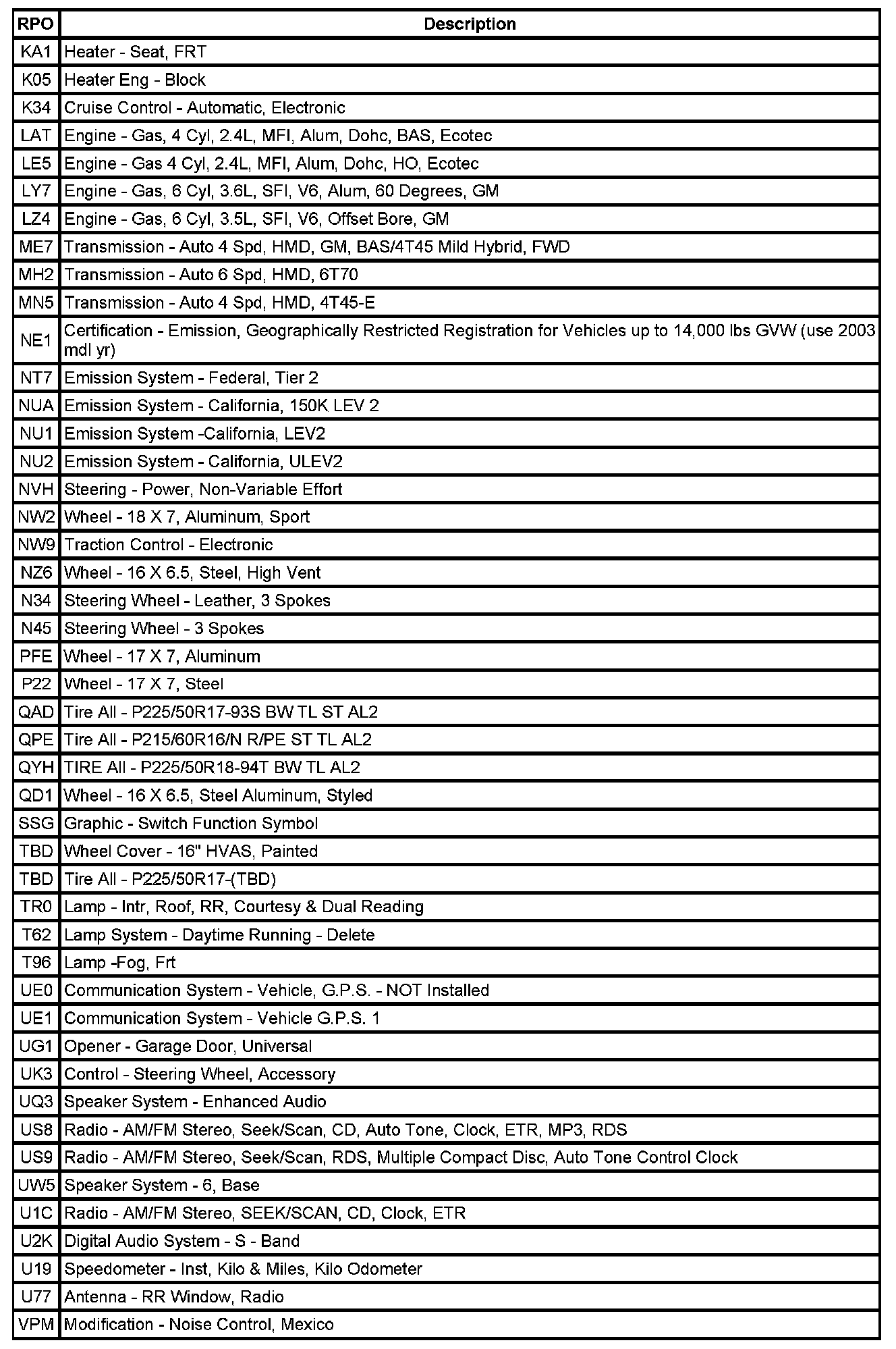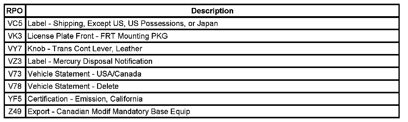 The following table provides the description of the Regular Production Option (RPO) codes that are available on the vehicle. The vehicle's RPO list is printed on the Service Parts Identification Label.