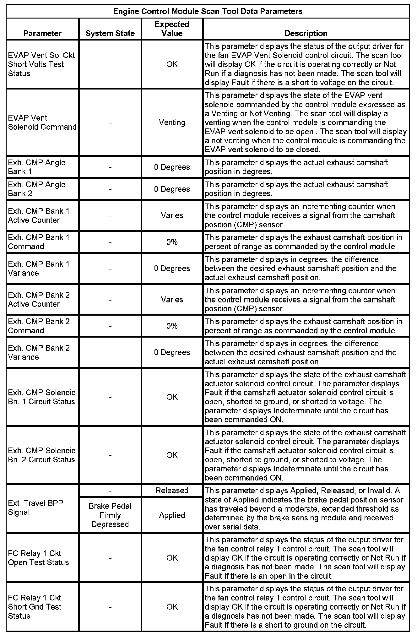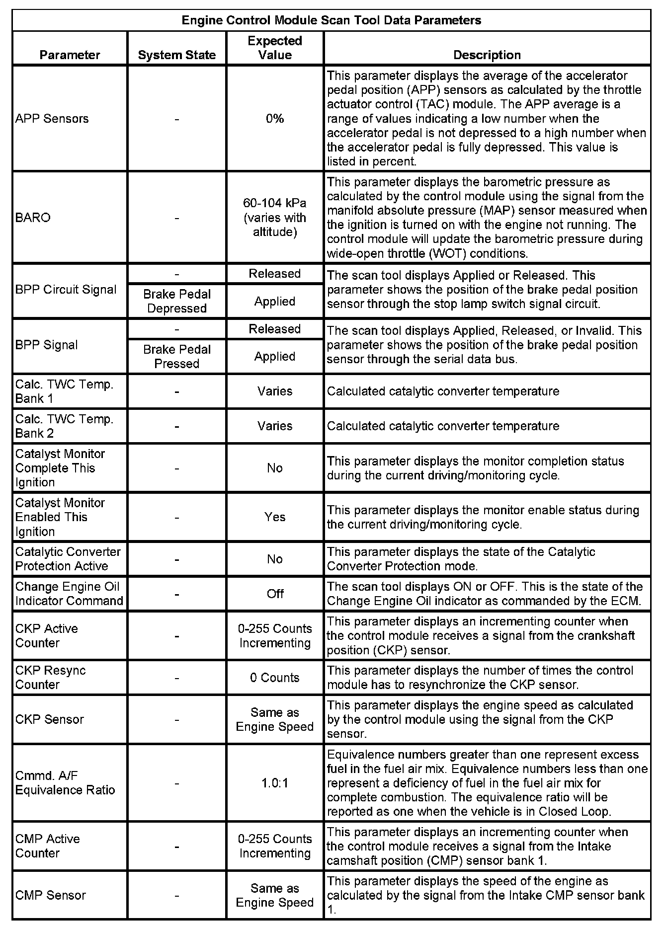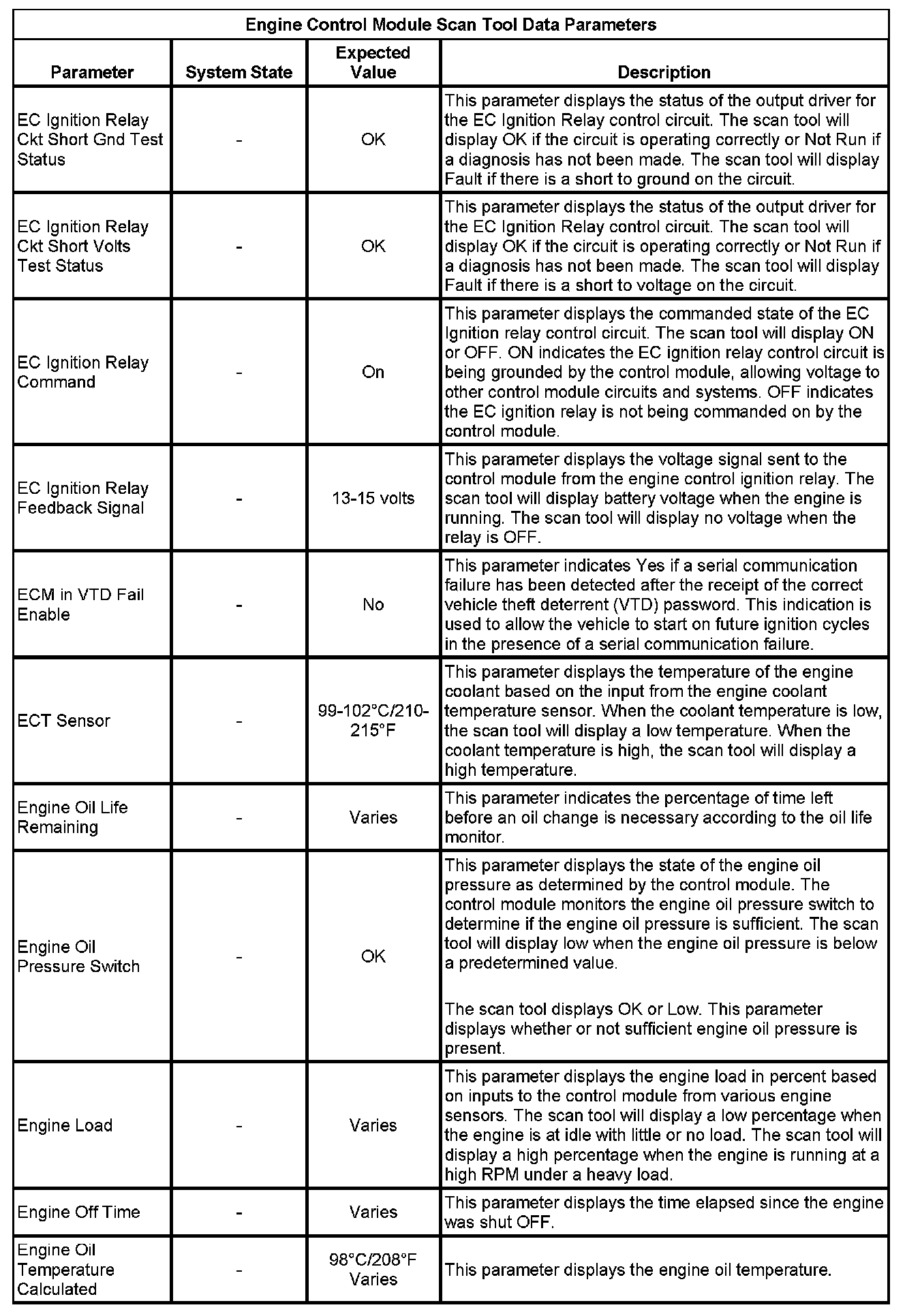 The Engine Control Module Scan Tool Data List contains all engine-related parameters that are available on the scan tool. The list is arranged in alphabetical order. A given parameter may appear in any one of the data lists, and in some cases may appear more than once, or in more than one data list in order to group certain related parameters together.