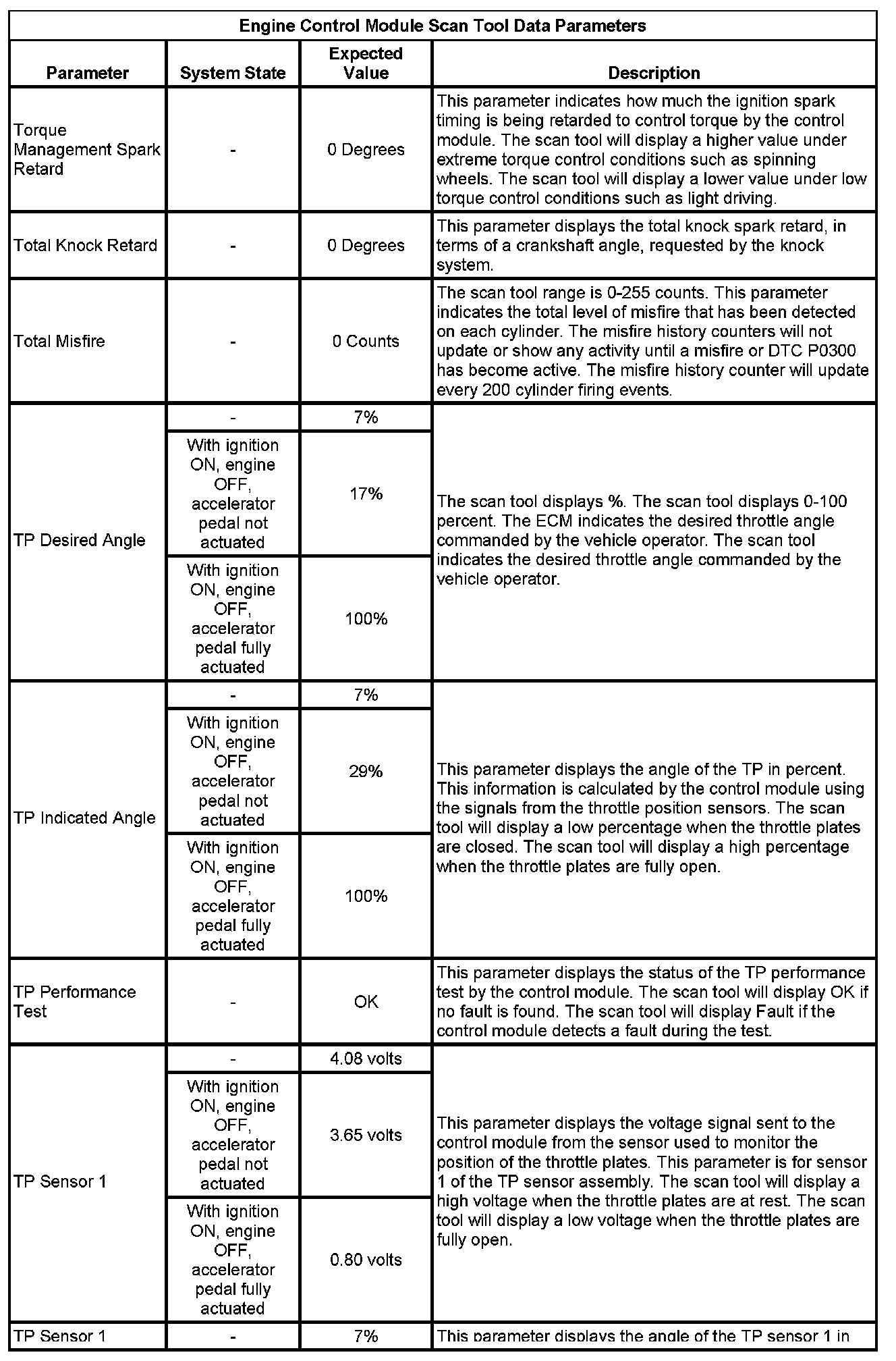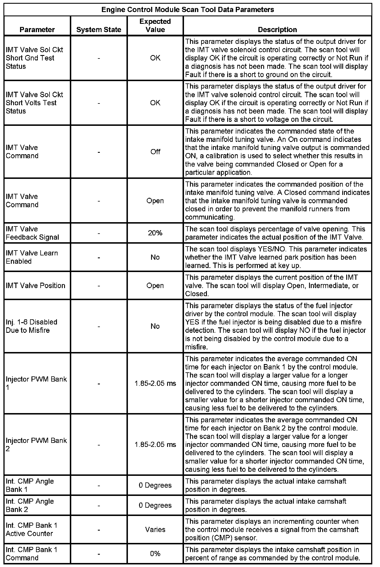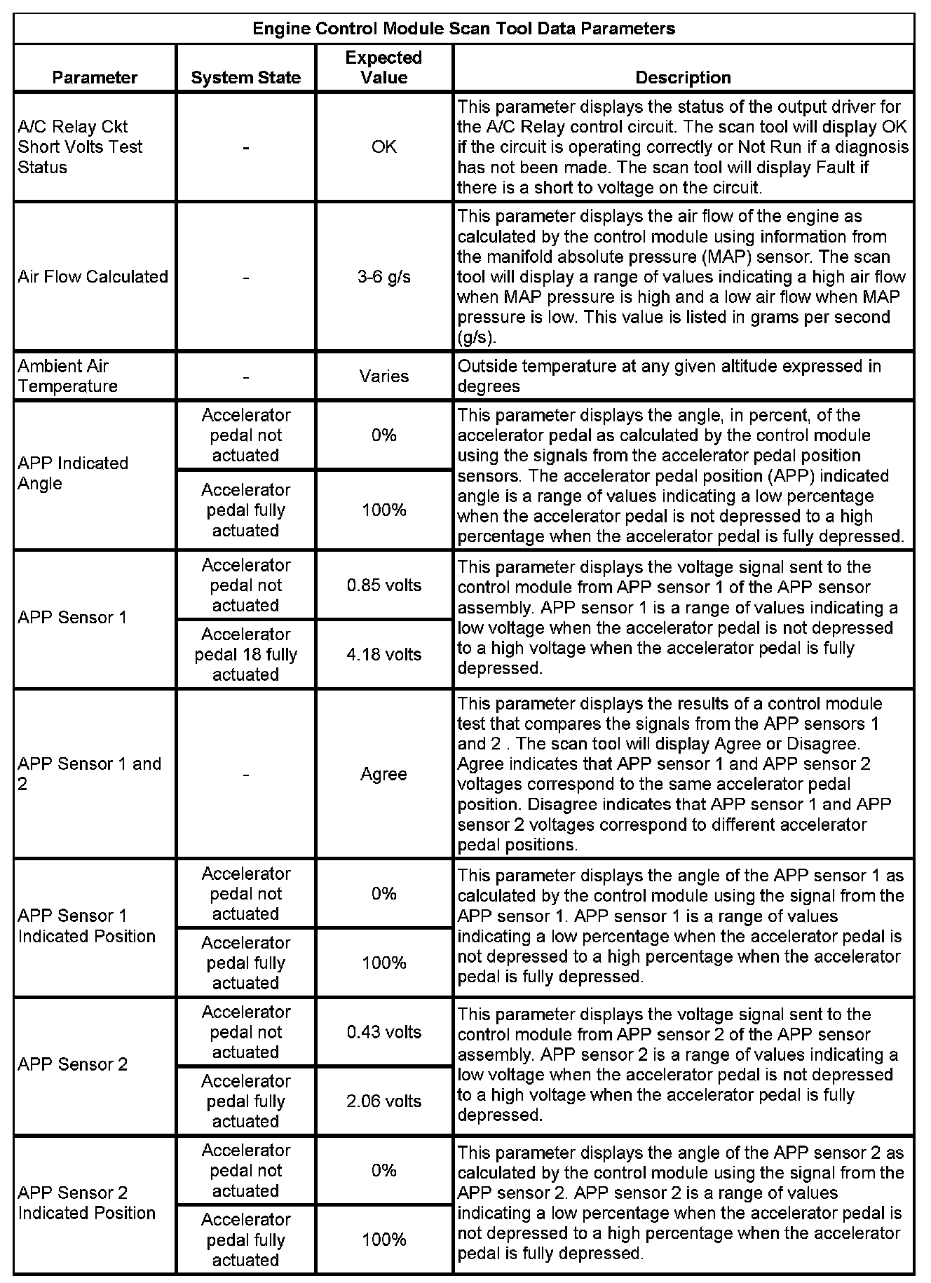 The Engine Control Module Scan Tool Data List contains all engine-related parameters that are available on the scan tool. The list is arranged in alphabetical order. A given parameter may appear in any one of the data lists, and in some cases may appear more than once, or in more than one data list in order to group certain related parameters together.