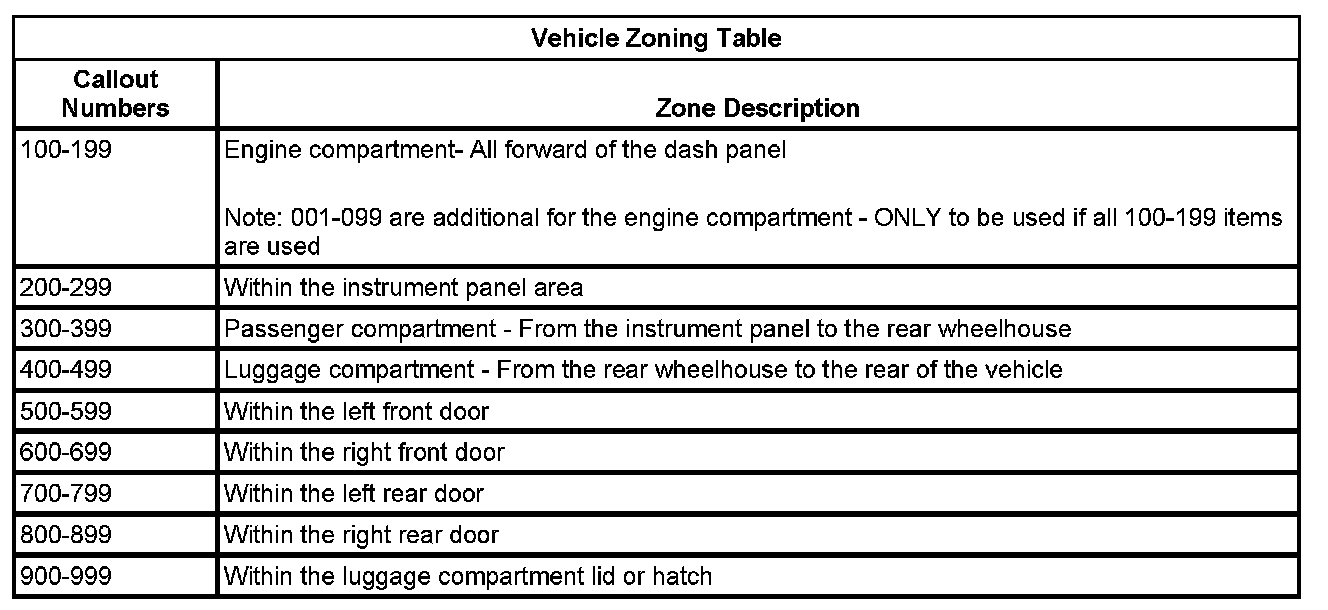 All grounds, in-line connectors, pass-through grommets, and splices have identifying numbers that correspond to where they are located in the vehicle. The following table explains the numbering system.